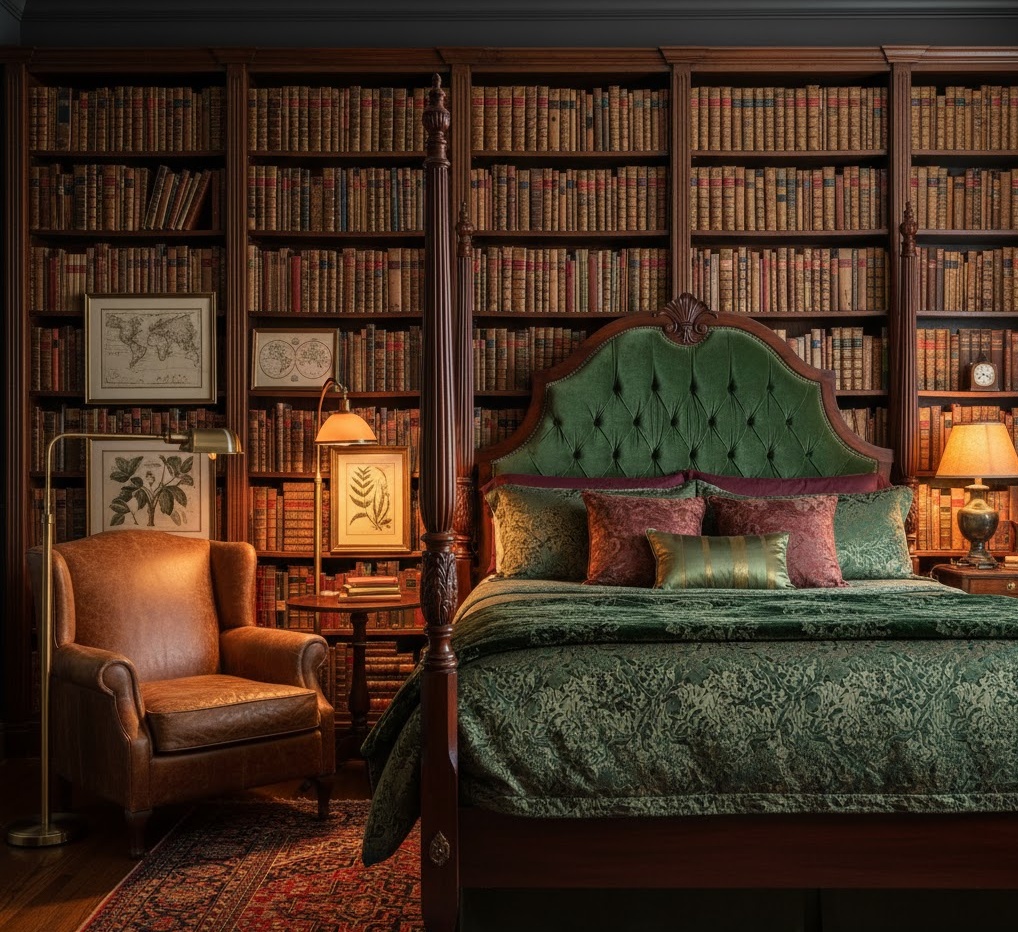 Dark academia bedroom ideas evoke a sophisticated, intellectual, and slightly melancholic atmosphere, inspired by classic literature, ancient universities, and a love for learning. The design features a rich, deep colour palette of forest greens, burgundy, navy blue, and dark browns, often complemented by brass or gold accents. Materials are luxurious and traditional, including dark wood, leather, velvet, and tweed, creating a sense of old-world charm. Functionality often includes extensive bookshelves, a dedicated writing desk, and comfortable reading nooks. The mood is one of contemplative elegance and scholarly pursuit, perfect for those who appreciate history, literature, and a touch of gothic romance in their personal space.