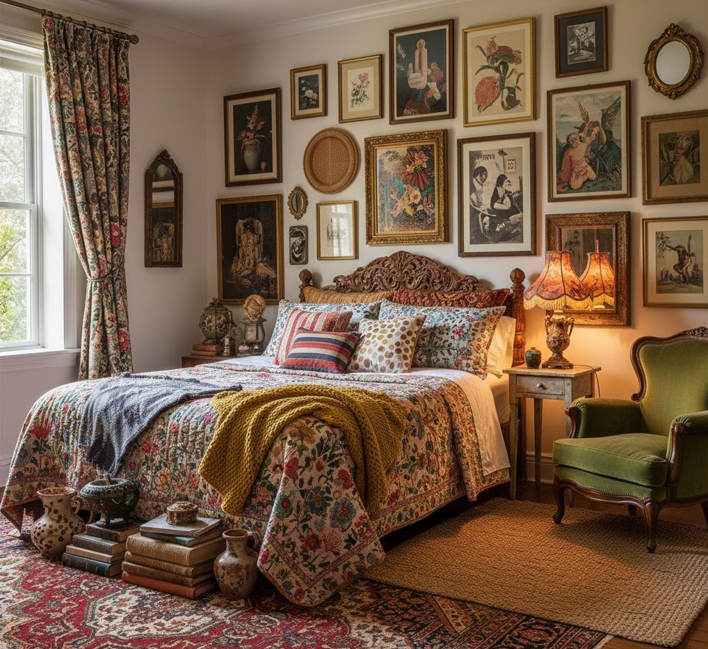 Eclectic chic bedroom inspiration celebrates individuality and a curated mix of styles, periods, and textures, resulting in a uniquely personal and vibrant space. This design approach encourages bold colour combinations, often incorporating a mix of bright hues with more subdued tones, creating visual interest and depth. Materials are diverse, ranging from vintage finds and global textiles to modern art and repurposed items, all harmoniously brought together. Functionality is highly adaptable, as furniture and decor are chosen for their character and ability to tell a story, rather than adhering to a strict design rule. The mood is one of playful sophistication and creative expression, offering a truly one-of-a-kind sanctuary.