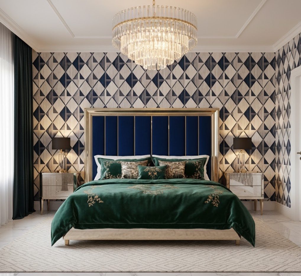 Glamourous Art Deco bedroom ideas transport you to an era of lavish sophistication and geometric elegance, inspired by the roaring twenties. This luxurious style is defined by bold geometric patterns, mirrored surfaces, and rich, deep colour palettes featuring emerald greens, sapphire blues, and ruby reds, often accented with gold or brass. Materials are opulent, including velvet, silk, polished wood, and chrome, creating a sense of grandeur and extravagance. Functionality is often disguised by decorative elements, with furniture pieces designed to be both practical and visually striking. The mood is one of dramatic luxury and refined indulgence, perfect for those who desire a bedroom that makes a statement.