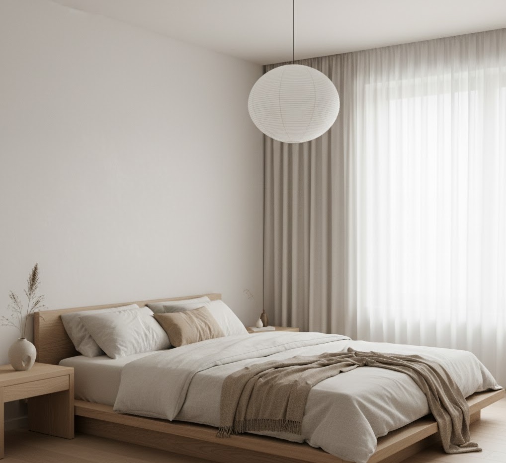Japandi bedroom aesthetics beautifully blend the minimalist elegance of Japanese design with the warm functionality of Scandinavian style, creating a serene and harmonious space. This hybrid style is characterised by clean lines, uncluttered surfaces, and a muted colour palette of soft greys, whites, and natural wood tones, often with subtle black accents. Materials are natural and tactile, including light-toned wood, bamboo, linen, and ceramic, emphasising craftsmanship and simplicity. Functionality is paramount, with furniture designed for both beauty and practical use, often featuring low-profile pieces and integrated storage. The mood is one of quiet contemplation and balanced serenity, fostering a peaceful and uncluttered mind.