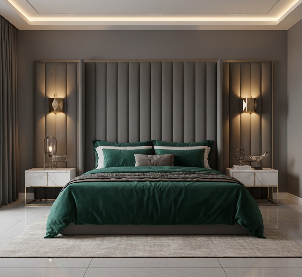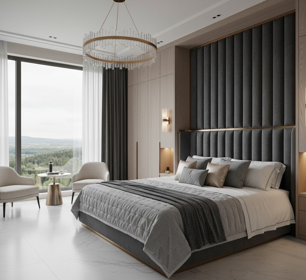 Modern luxury bedroom ideas epitomise sophistication and comfort, blending sleek contemporary aesthetics with opulent materials and high-end finishes. The colour scheme often leans towards a refined palette of deep greys, rich metallics, muted jewel tones, and crisp whites, creating an atmosphere of understated elegance. Materials are paramount, featuring plush velvets, polished marble, high-gloss lacquers, and brushed brass or chrome accents. Functionality is seamlessly integrated with smart home technology, automated lighting, and bespoke storage solutions, all designed for ultimate convenience. The mood is one of exclusive comfort and grandeur, offering a lavish retreat that feels both cutting-edge and timelessly chic.