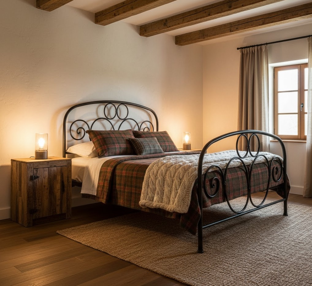 Rustic farmhouse bedroom ideas evoke a sense of warmth, comfort, and nostalgic charm, drawing inspiration from rural living and traditional craftsmanship. The design heavily features natural and reclaimed materials, such as distressed wood, wrought iron, and natural fibres like cotton and wool. A soft, inviting colour palette of warm neutrals, creams, and muted pastels dominates, creating a cosy and welcoming atmosphere. Functionality is practical and robust, with sturdy furniture pieces that often show signs of age or wear, adding to their character. The mood is one of homely serenity and unpretentious elegance, perfect for creating a comforting escape from the hustle and bustle of modern life.