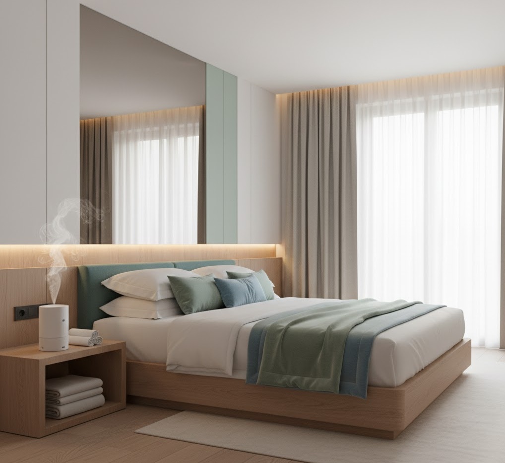 Serene spa bedroom concepts are designed to transform your sleeping space into a tranquil oasis, promoting ultimate relaxation and well-being. The colour palette is typically calming and soothing, featuring soft aquas, sage greens, muted blues, and crisp whites, evoking a sense of natural harmony. Materials are chosen for their tactile comfort and natural origins, such as plush organic cotton, smooth stone, light wood, and delicate linen. Functionality focuses on creating a peaceful environment, incorporating elements like aromatherapy diffusers, indirect lighting, and minimalist decor to reduce visual clutter. The mood is one of profound tranquility and restorative peace, offering a perfect escape for unwinding and rejuvenating after a long day.