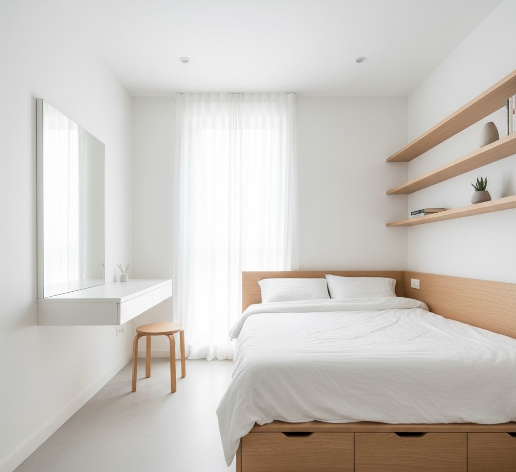 Small space bedroom solutions focus on maximising every square metre, transforming compact areas into highly functional and stylish retreats. The design prioritises clever storage, multi-functional furniture, and a light, airy aesthetic to create the illusion of more space. A bright colour palette of whites, pale greys, and soft pastels helps to open up the room, often complemented by mirrors to reflect light and expand visual depth. Materials are typically lightweight and streamlined, such as light wood, metal, and simple fabrics, to avoid overwhelming the space. Functionality is paramount, with features like wall-mounted shelving, under-bed storage, and compact desks. The mood is one of efficient comfort and ingenious design, proving that small can indeed be mighty.