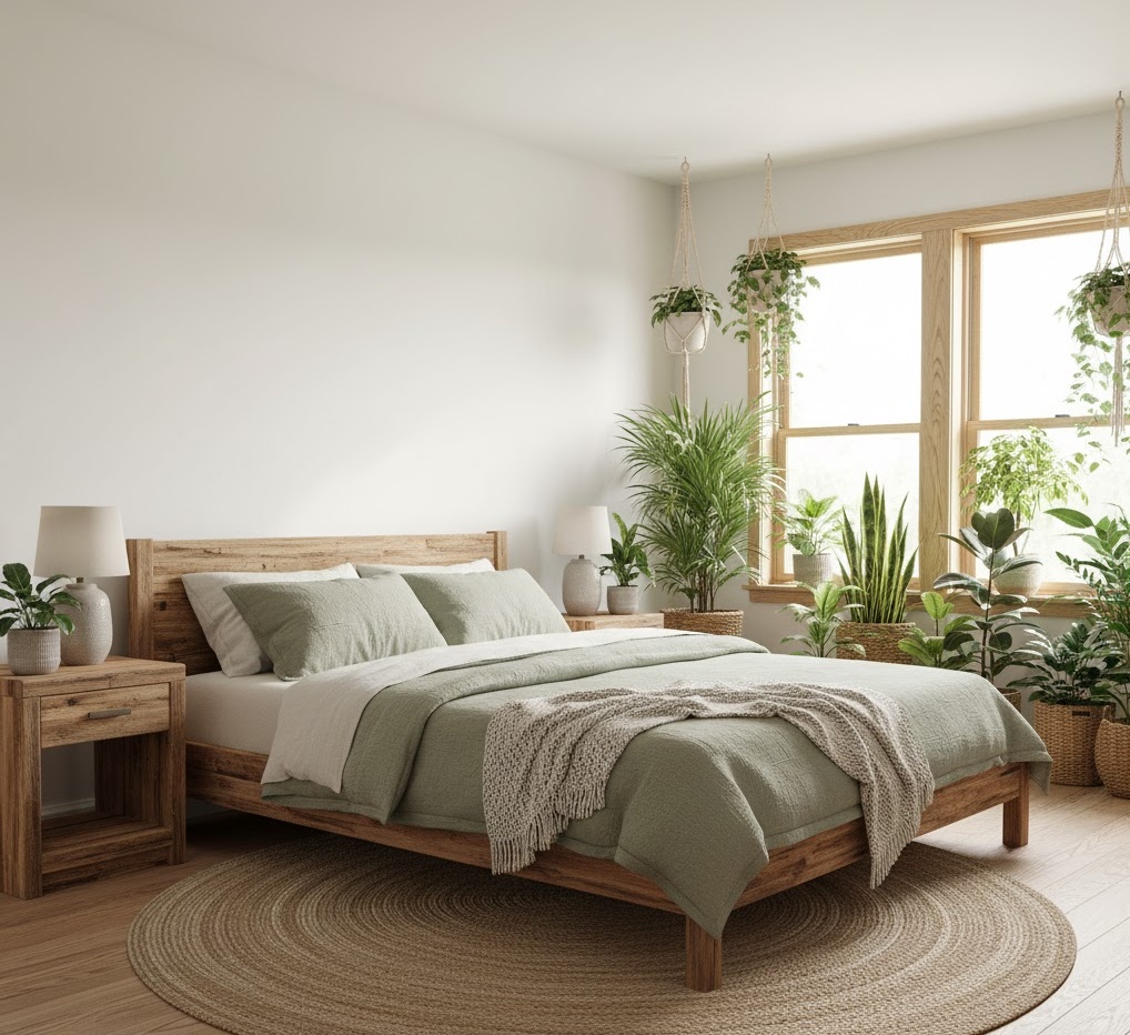 Sustainable green bedroom ideas prioritise environmental responsibility and well-being, creating a healthy and eco-conscious sleeping environment. The design focuses on using natural, recycled, or upcycled materials, such as reclaimed wood, organic cotton, bamboo, and low-VOC paints. The colour palette often reflects nature, featuring earthy tones, soft greens, blues, and whites, promoting a calming and harmonious atmosphere. Functionality includes energy-efficient lighting, natural ventilation, and furniture made from sustainably sourced timber. An abundance of indoor plants not only purifies the air but also adds to the serene aesthetic. The mood is one of mindful tranquility and connection to nature, fostering a sense of peace and environmental stewardship.
