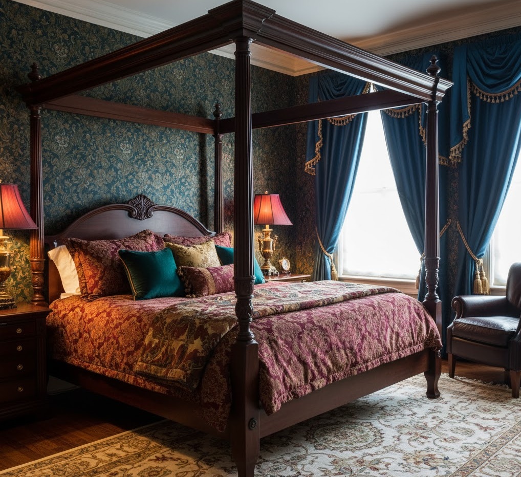 Traditional classic bedroom ideas embody timeless elegance and enduring comfort, drawing inspiration from historical design periods. This style is characterised by ornate, well-crafted furniture, often made from rich, dark woods like mahogany or cherry, featuring intricate carvings and detailing. The colour palette typically includes deep, sophisticated hues such as burgundy, forest green, navy blue, and cream, often paired with damask or floral patterns. Materials are luxurious and enduring, including silk, velvet, brocade, and fine cotton, contributing to a sense of refined opulence. Functionality is centred around comfort and durability, with substantial pieces designed to last. The mood is one of stately grace and inviting warmth, creating a truly classic and distinguished retreat.