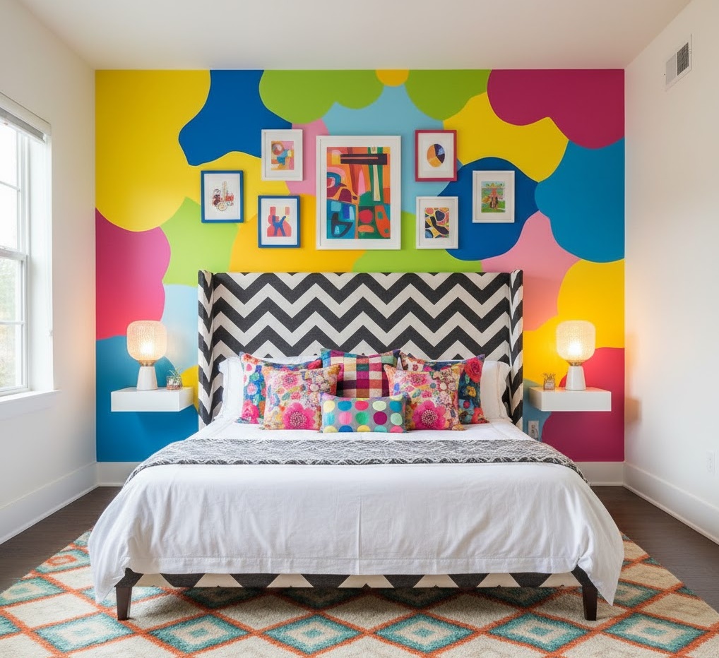 Vibrant colourful bedroom ideas embrace bold hues and playful patterns to create an energetic, joyful, and highly personalised space. This design style encourages experimentation with a diverse colour palette, from bright primary colours to rich secondary shades, often used in unexpected combinations. Materials can range from painted wood and colourful textiles to unique art pieces and statement lighting, all contributing to a lively aesthetic. Functionality is often secondary to visual impact, with furniture and decor chosen for their ability to add character and express individuality. The mood is one of exuberant happiness and creative freedom, perfect for those who want their bedroom to be a true reflection of their vibrant personality.