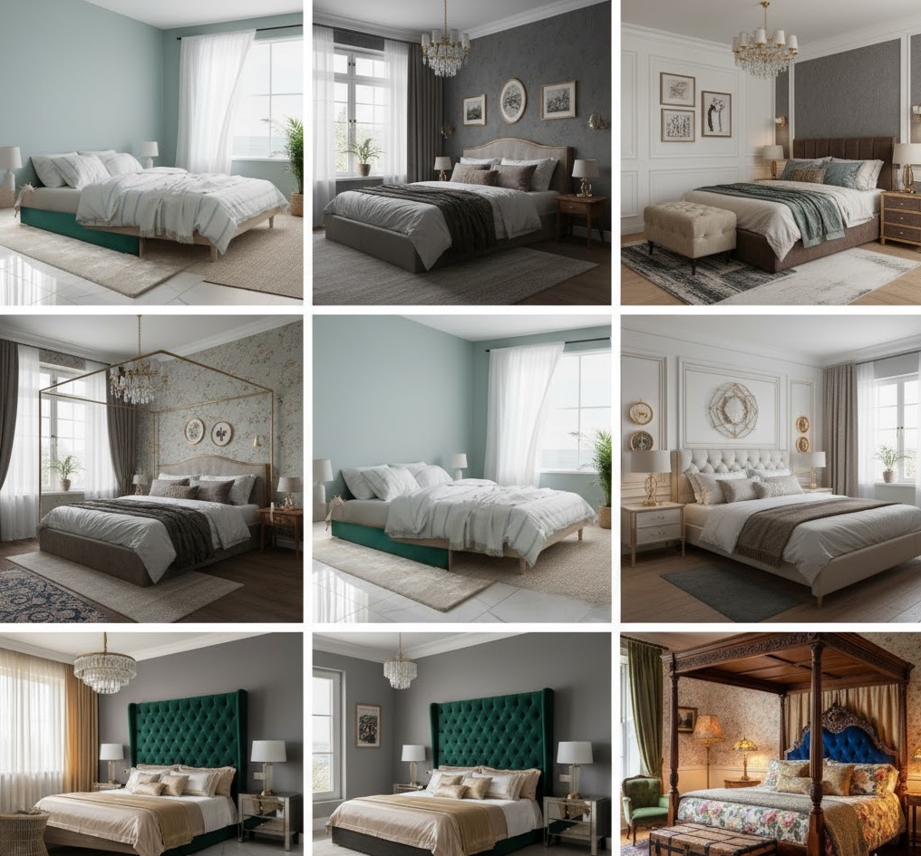 The Art Deco aesthetic bedroom embodies the unparalleled glamour and sophisticated elegance of the 1920s and 30s, beautifully characterised by bold geometric patterns and an array of luxurious, high-end materials. Rich jewel tones like deep emerald green, vibrant sapphire blue, and opulent ruby red are often strikingly paired with classic black, gleaming gold, and polished silver. Key materials include highly polished chrome, reflective mirrored surfaces, sumptuous velvet, sleek lacquered wood, and exotic veneers, all meticulously chosen to create an opulent and dramatically chic feel. Functionality focuses on statement furniture pieces with distinctive silhouettes, elegant, often geometric lighting fixtures, and decorative accents that exude luxury. This aesthetic fosters a lavish, stylish, and truly timeless mood, perfect for those who appreciate historical grandeur and refined design.