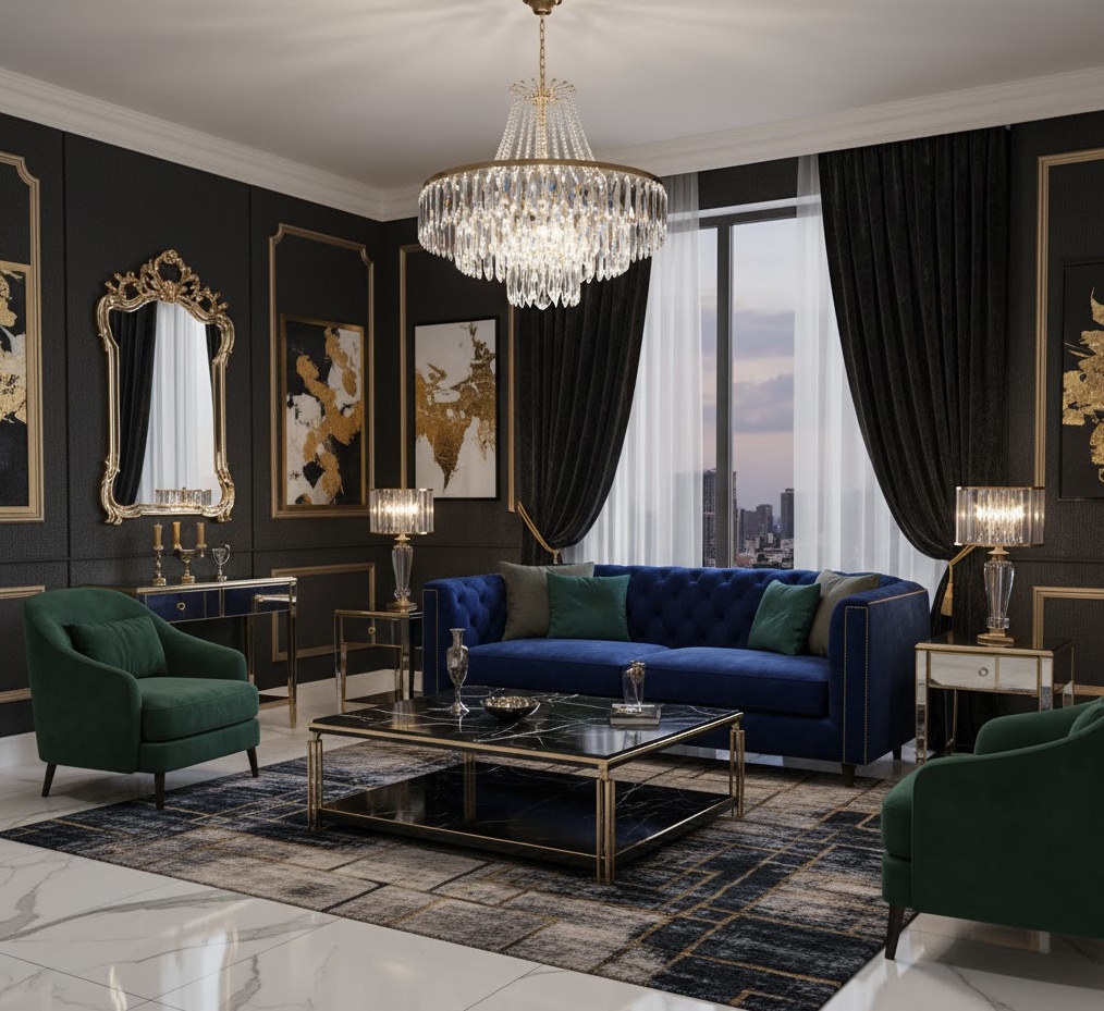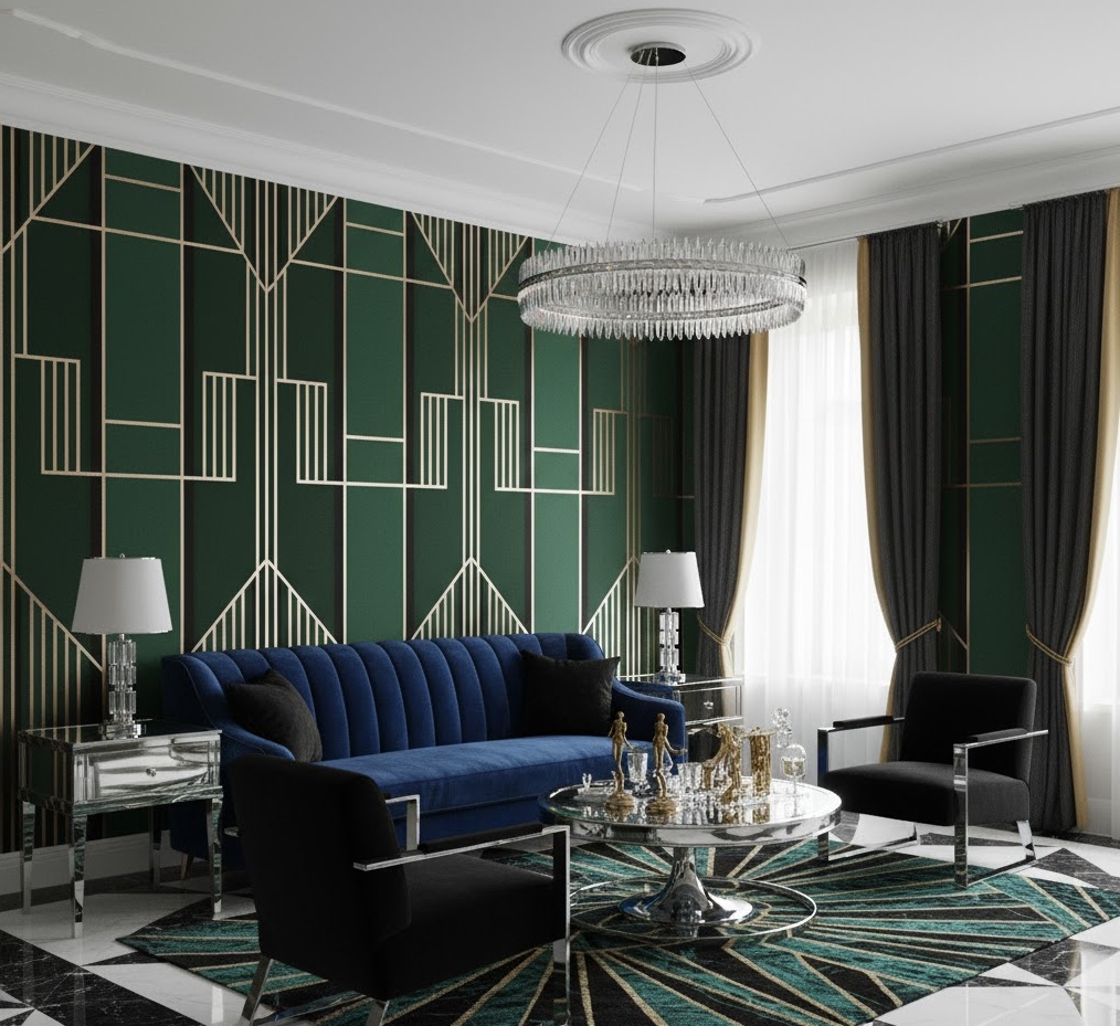 Art Deco glam aesthetic rooms exude sophistication, luxury, and a distinctive geometric elegance inspired by the 1920s and 30s. This style features a bold colour palette of deep jewel tones like emerald green, sapphire blue, and ruby red, often contrasted with black, white, and metallic accents. Materials such as polished chrome, brass, velvet, mirrored surfaces, and exotic woods are prominent, creating a lavish and opulent mood. Functionality is about statement furniture, intricate patterns, and decorative elements that showcase a sense of grandeur and refined taste. It’s a design that makes a powerful, glamorous statement.