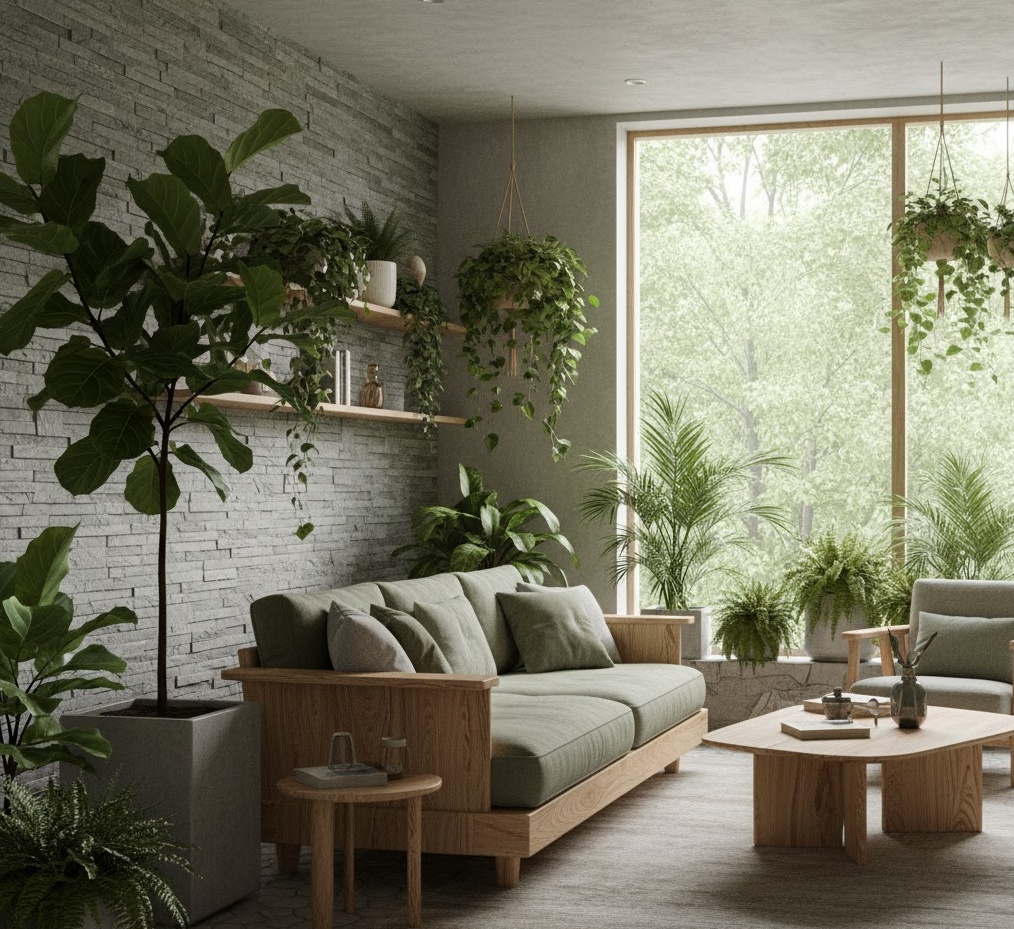 Biophilic nature aesthetic spaces seamlessly integrate natural elements into the interior, fostering a deep connection to the outdoors and promoting well-being. This style features an earthy colour palette of greens, browns, blues, and natural wood tones, creating a calming and restorative atmosphere. Materials like living plants, natural wood, stone, bamboo, and organic textiles are paramount, blurring the lines between indoor and outdoor environments. Functionality is about maximising natural light, improving air quality, and creating a serene retreat that enhances mental and physical health. It’s a design that celebrates life and brings the tranquillity of nature inside.