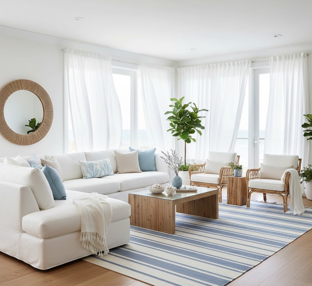 Coastal serene aesthetic spaces bring the calming essence of the seaside indoors, creating a light, airy, and refreshing atmosphere. This style features a crisp colour palette of whites, blues, and sandy beiges, reminiscent of beaches and ocean waves. Natural materials like driftwood, rattan, linen, and cotton are key, evoking a relaxed, holiday-like mood. Functionality is about open spaces, comfortable seating, and subtle nautical accents, making the room feel like a tranquil escape. It’s a design that promotes relaxation and a connection to nature, perfect for unwinding after a long day.