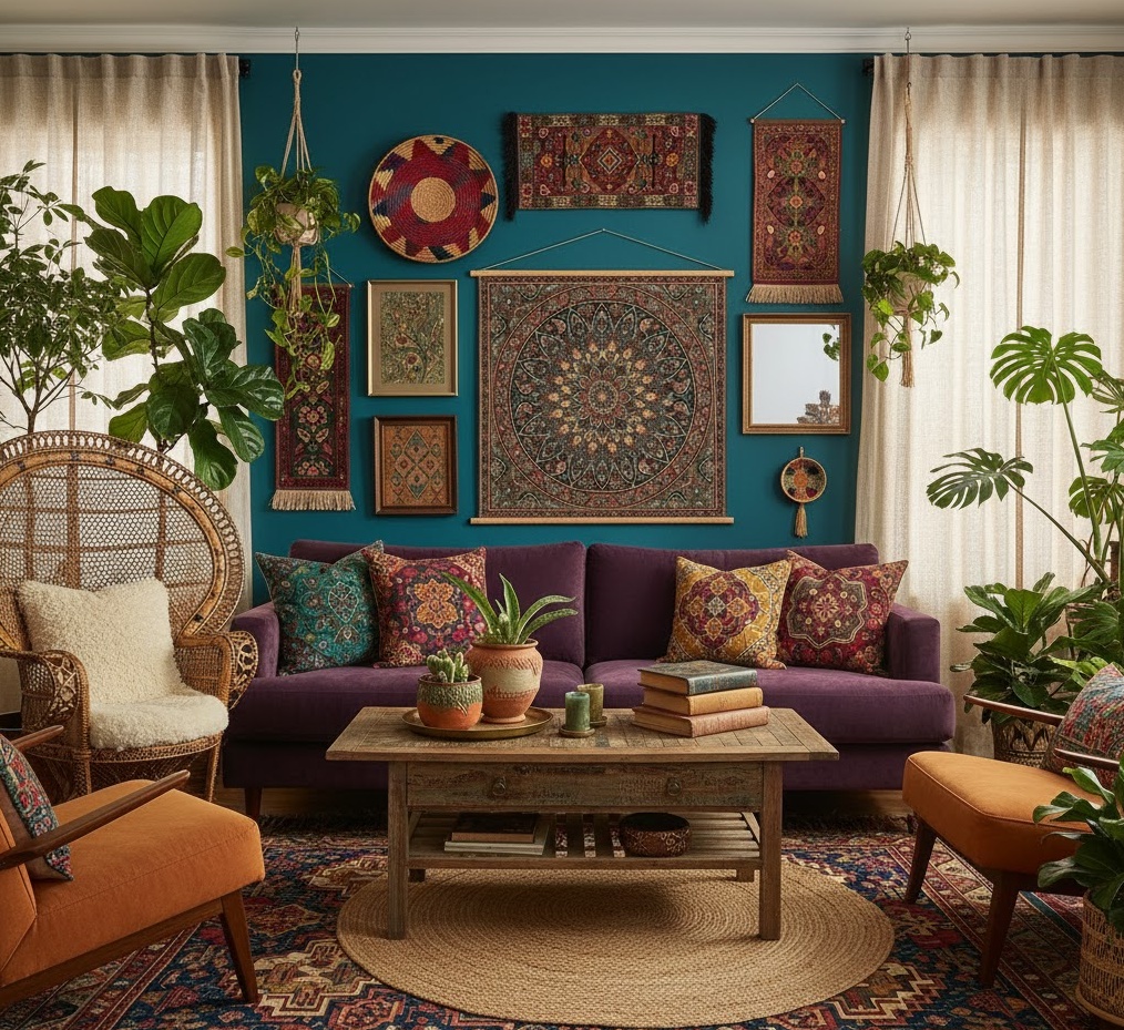 Eclectic bohemian aesthetic rooms are a vibrant celebration of global influences, artistic expression, and a fearless mix-and-match approach. This style embraces a rich, diverse colour palette, often combining jewel tones with earthy hues and bold patterns. Materials like vintage textiles, handcrafted items, reclaimed wood, and an abundance of plants create a layered, lived-in feel. Functionality is about creating a comfortable, inspiring space that tells a story, with unique furniture pieces, travel souvenirs, and art from various cultures. It’s a truly personal aesthetic, reflecting a free-spirited personality and a love for the unconventional.