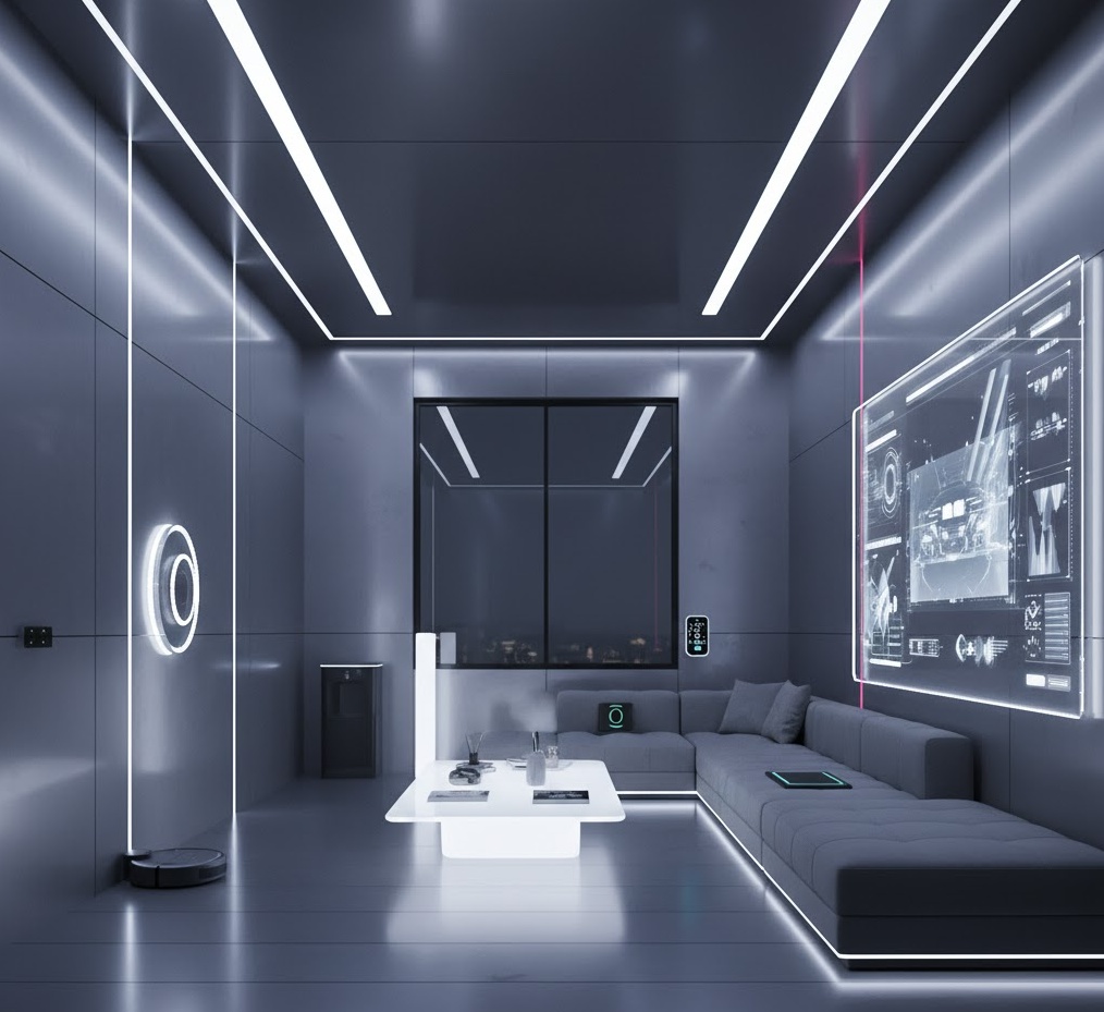 Futuristic tech aesthetic rooms envision a sleek, innovative living space, blending cutting-edge technology with minimalist design. This style often uses a cool, monochromatic colour palette of greys, whites, and blacks, accented with neon lights or subtle metallic sheens. Materials like polished metal, glass, smart fabrics, and integrated LED lighting are central, creating a high-tech, streamlined environment. Functionality is paramount, with smart home devices, hidden storage, and multi-functional furniture designed for efficiency and modern convenience. It’s a forward-thinking aesthetic that embraces innovation and a clean, uncluttered vision of the future.