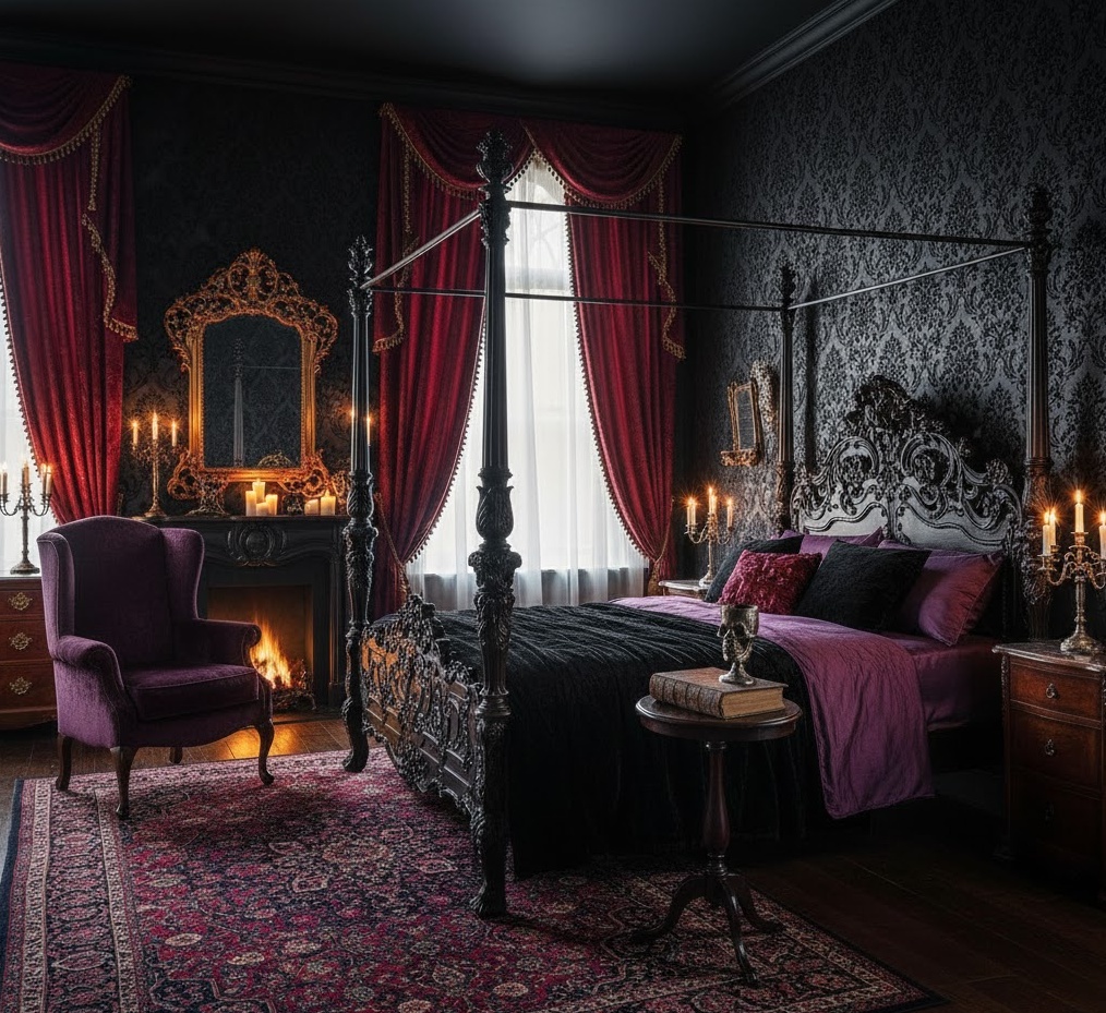 Gothic romantic aesthetic rooms delve into a world of dramatic elegance, historical mystique, and a touch of dark allure. This style is characterised by a deep, moody colour palette of black, deep purples, crimson, and forest green, often accented with antique gold or silver. Materials like dark wood, velvet, wrought iron, lace, and ornate carvings are central, creating a theatrical and sophisticated atmosphere. Functionality is about creating intimate, atmospheric spaces with heavy drapes, candelabras, and vintage curiosities, evoking a sense of timeless romance and enigmatic charm. It’s a design that embraces the dramatic and the beautifully melancholic.