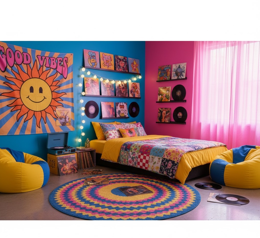 Indie kid aesthetic vibes transform a room into a vibrant, expressive haven, celebrating individuality and creative freedom. This style bursts with bold colours, playful patterns, and an eclectic mix of textures, often featuring DIY elements and thrifted treasures. Bright yellows, electric blues, and neon pinks dominate, creating an energetic and optimistic mood. Materials like patchwork textiles, graphic prints, vinyl records, and quirky art pieces are central to its charm. Functionality is about creating a space for self-expression, music, and art, making it a lively and unconventional sanctuary that truly reflects a unique personality.