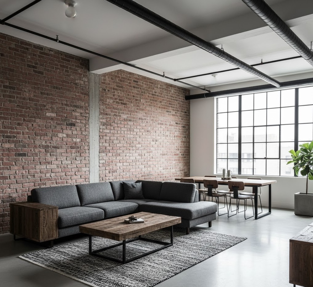 Industrial loft aesthetic ideas transform spaces with a raw, urban edge, celebrating the beauty of exposed structural elements and utilitarian design. This style features a monochromatic colour scheme of greys, blacks, and whites, often complemented by the warm tones of natural wood and brick. Materials like exposed brickwork, concrete, metal piping, and reclaimed wood are central, creating a robust and authentic atmosphere. Functionality is about open-plan living, practical furnishings, and a focus on durability, reflecting a no-nonsense, yet stylish approach to interior design. It’s a look that feels authentic, strong, and effortlessly cool.