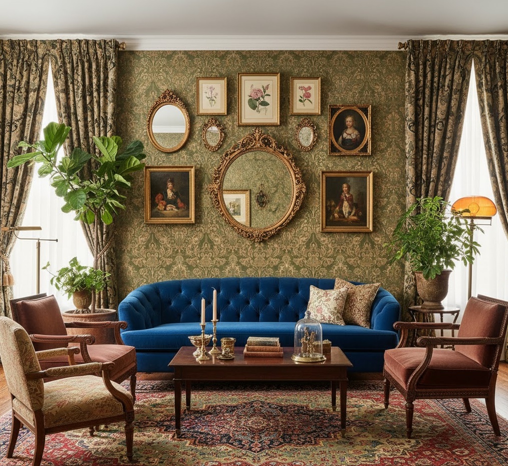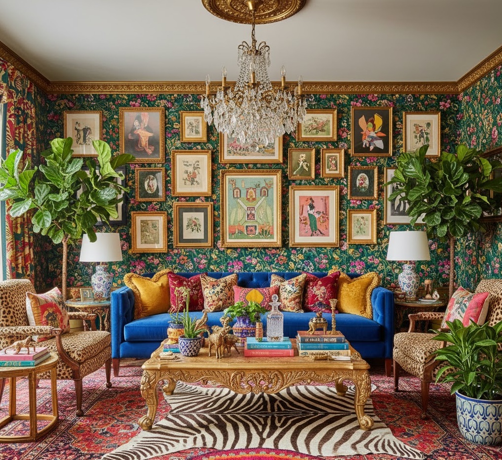 Maximalist bold aesthetic rooms are a vibrant explosion of colour, pattern, and texture, celebrating abundance and personal expression without restraint. This style embraces a rich, often clashing colour palette, combining bright hues, jewel tones, and intricate patterns in a joyful display. Materials like velvet, silk, ornate wallpaper, layered rugs, and an array of decorative objects are central, creating a visually stimulating and opulent environment. Functionality is about showcasing personality and passion, with every surface adorned and every corner telling a story. It’s a design that rejects minimalism in favour of a lavish, curated chaos that is uniquely captivating.