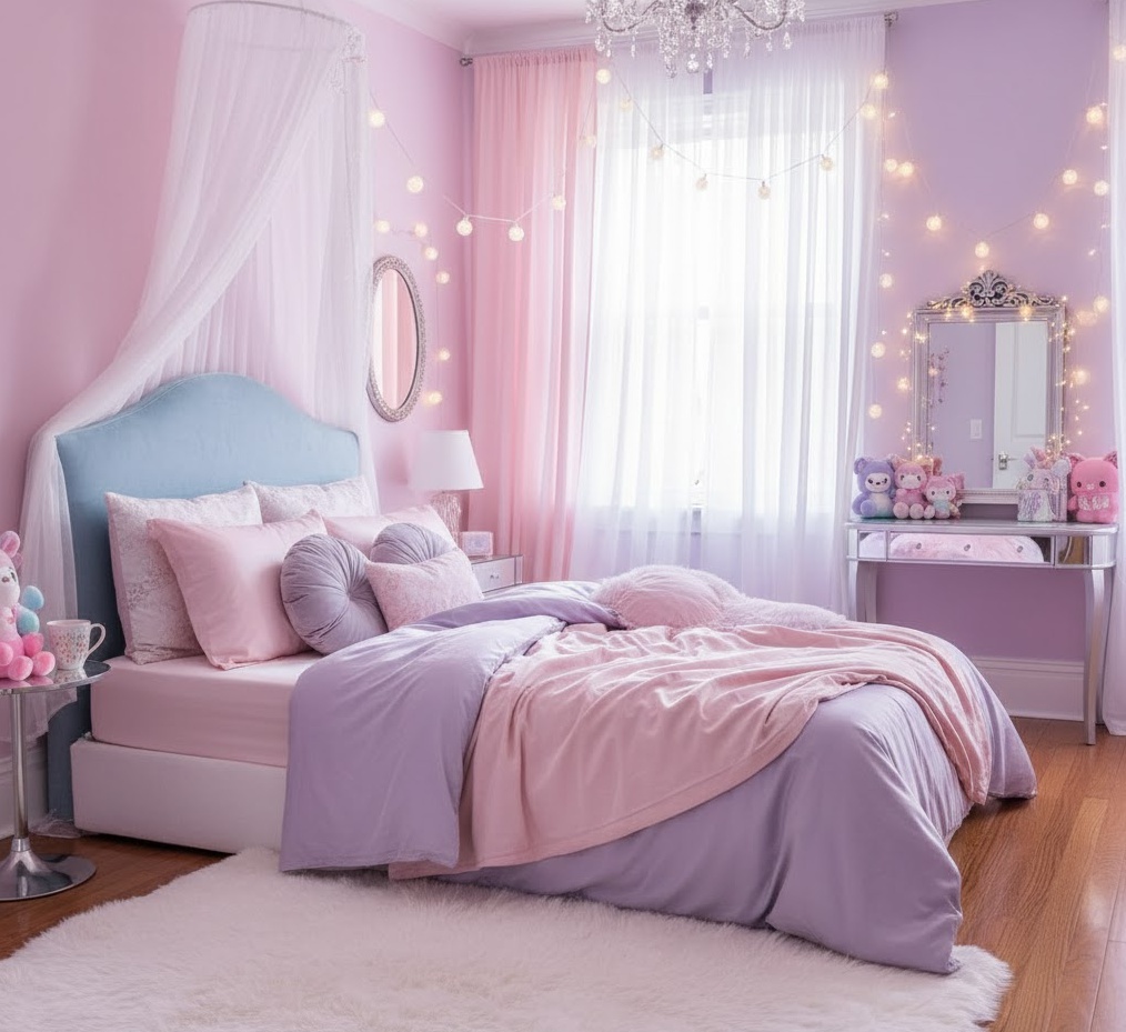 The soft girl aesthetic sanctuary is a haven of gentle pastels, plush textures, and an overwhelmingly sweet, comforting atmosphere. This style embraces a delicate colour palette of baby pinks, lavenders, sky blues, and creamy whites, creating a dreamy and innocent mood. Materials like faux fur, velvet, sheer fabrics, and iridescent accents are prominent, adding to the soft, ethereal feel. Functionality focuses on creating a cosy, inviting space for relaxation and self-care, often featuring plush bedding, fairy lights, and cute decorative items. It’s a space designed to feel safe, comforting, and utterly charming, perfect for unwinding.