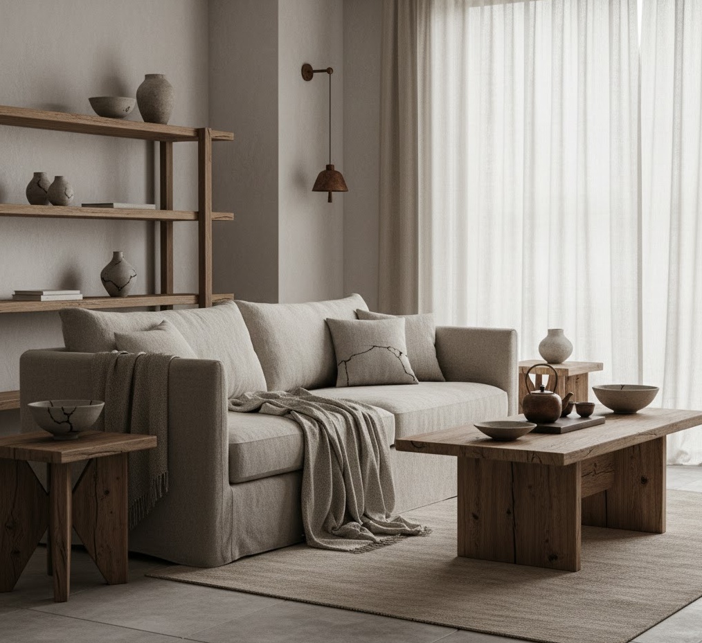 Wabi-Sabi imperfect aesthetic rooms celebrate the beauty of imperfection, transience, and authenticity, embracing natural wear and the passage of time. This style uses a muted, earthy colour palette of natural whites, greys, browns, and subtle greens, reflecting the raw beauty of nature. Materials like untreated wood, rough ceramics, linen, and aged metals are central, showcasing their inherent textures and unique flaws. Functionality is about simplicity, quiet contemplation, and finding beauty in the unrefined, creating a humble yet profoundly peaceful space. It’s an aesthetic that values the story behind each object and the serene acceptance of impermanence.