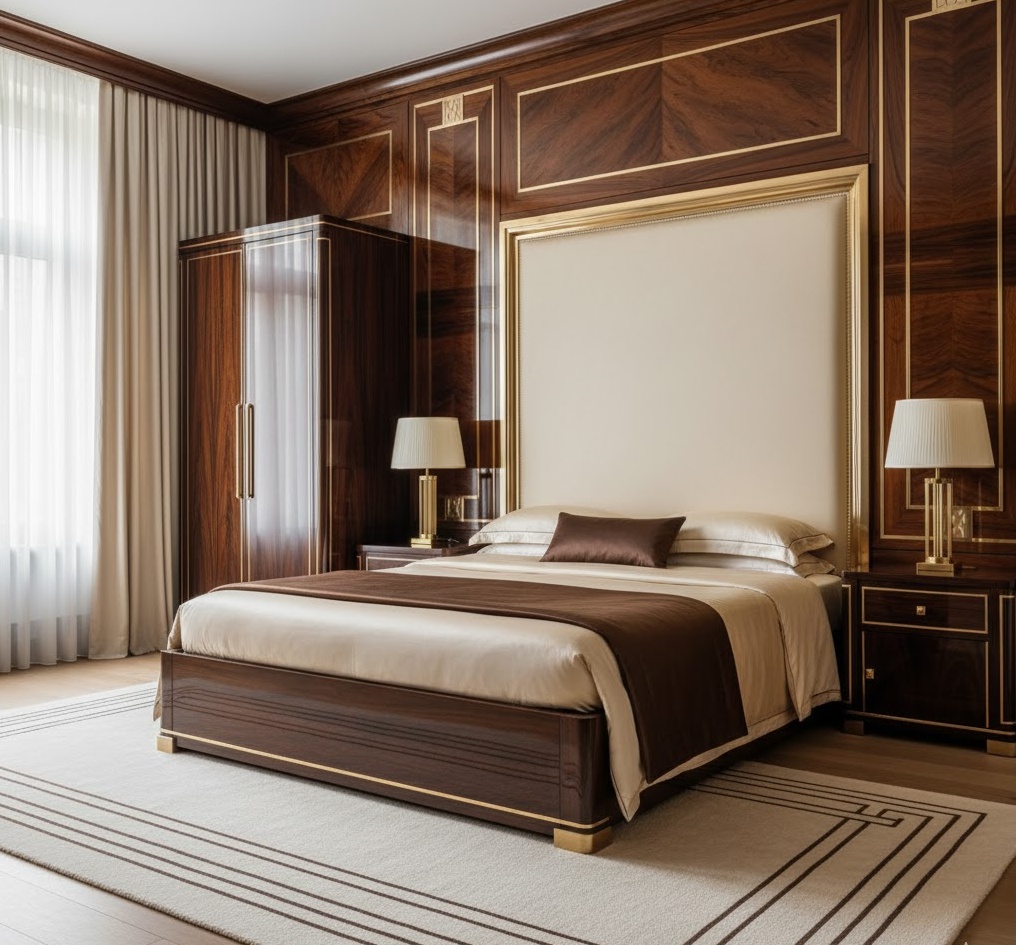 An exotic wood deco bedroom celebrates the era’s fascination with rare and luxurious timber, creating a rich, sophisticated, and globally inspired aesthetic. Materials such as macassar ebony, zebrawood, rosewood, or amboyna burl are prominently featured in furniture, wall panelling, and decorative inlays, showcasing their unique grain patterns and deep, lustrous colours. These exotic woods are often highly polished and contrasted with lighter veneers, mother-of-pearl, or polished metals like chrome or brass, highlighting their inherent beauty. The colour palette tends to be warm and earthy, with deep browns, creams, and subtle jewel tones, allowing the wood to be the star. Luxurious fabrics like silk and velvet complement the rich textures. This art deco bedroom style offers both a visually stunning and highly functional space, imbued with a sense of adventure and refined taste.