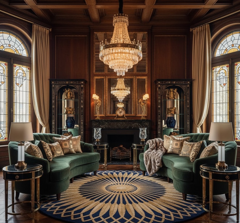 An opulent Art Deco lounge is a lavish display of luxury, where no expense is spared in creating a truly grand environment. Rich, exotic woods like ebony and rosewood are often paired with sumptuous fabrics such as silk, velvet, and brocade. Gold leaf, intricate marquetry, and bespoke artisan pieces are common, contributing to an atmosphere of unparalleled extravagance. The colour palette embraces deep, saturated jewel tones alongside shimmering metallics, evoking a sense of old-world glamour. This Art Deco living room is designed for ultimate comfort and impressive entertaining, a true statement of refined taste and functionality.