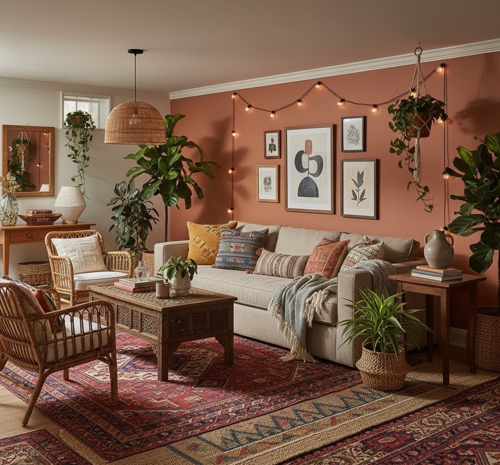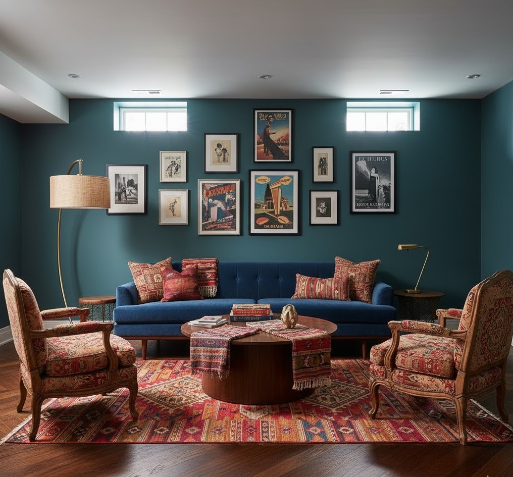 Inject vibrant personality into your home with a bohemian basement family zone. This eclectic style celebrates global influences, rich textures, and a free-spirited approach to design. Layered rugs, patterned textiles, and a mix of vintage and handcrafted furniture create a relaxed, inviting atmosphere. A diverse colour palette, often featuring jewel tones, earthy browns, and vibrant accents, adds to its unique charm. This basement family room encourages creativity and comfort, making it a wonderfully unconventional space for family members to unwind, express themselves, and enjoy a truly unique environment.