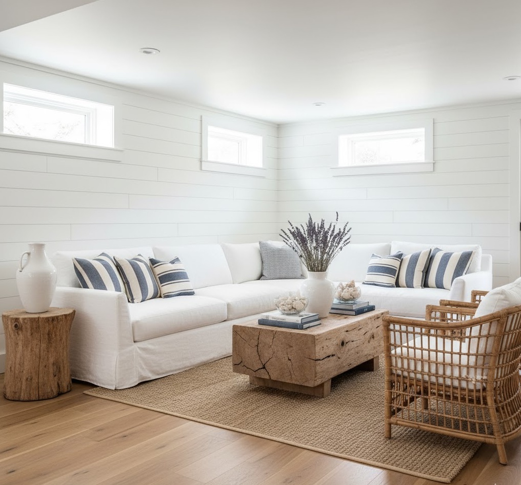 Bring the refreshing feel of the seaside to your home with a coastal basement family room. This style evokes a relaxed, airy atmosphere using a palette of blues, whites, and sandy neutrals. Natural textures like wicker, rattan, and linen are key, alongside light wood finishes and subtle nautical accents. The aim is to create a bright and breezy space that feels open and inviting, even below ground. This basement family room offers a tranquil escape, perfect for unwinding and enjoying a perpetual holiday vibe, making it a refreshing addition to any home.