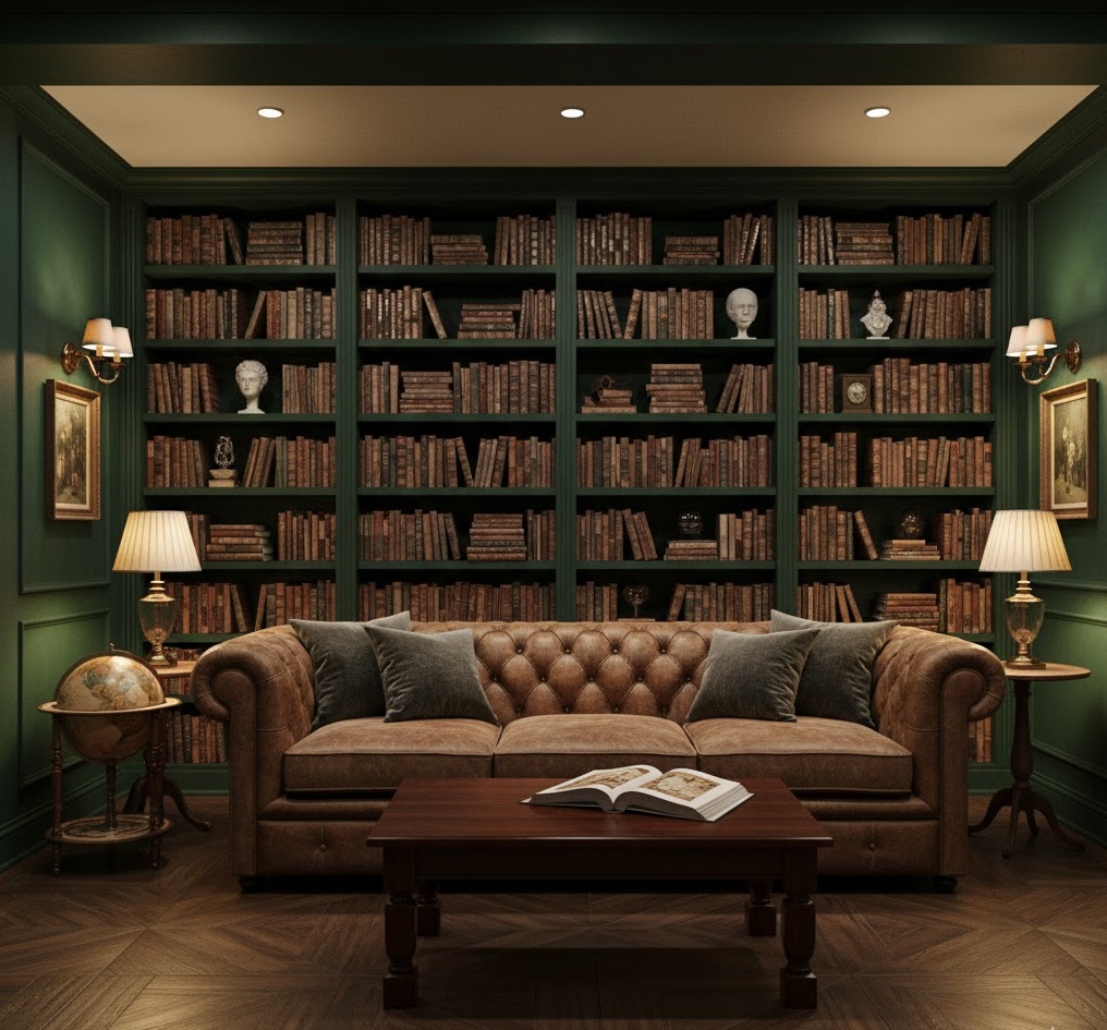 Cultivate an atmosphere of intellectual charm with a Dark Academia basement study, perfect for quiet contemplation or sophisticated family activities. This style embraces rich, deep colours like forest green, burgundy, and navy, combined with dark wood furniture, leather accents, and plenty of books. Think floor-to-ceiling bookshelves, antique globes, and vintage maps. The mood is scholarly and cosy, offering a refined retreat for reading, board games, or focused work. This basement family room transforms into a distinguished and inspiring space for the whole family.