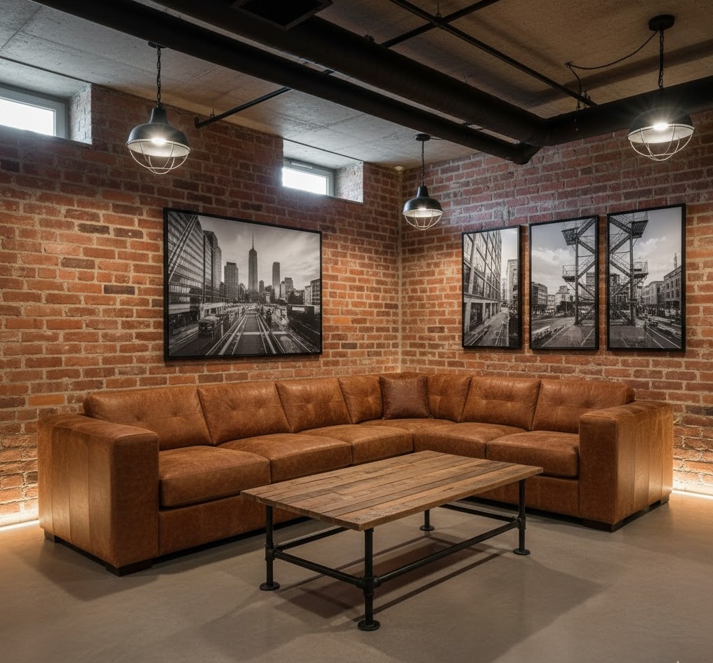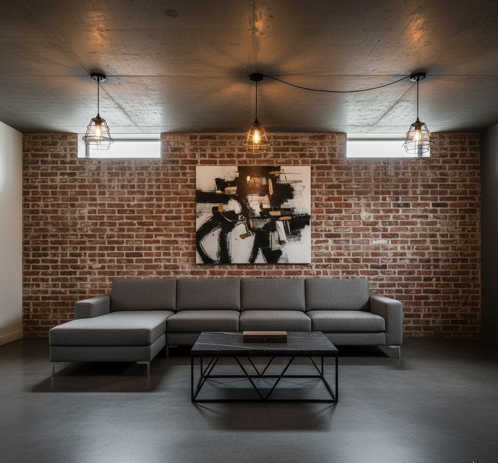 Unleash urban chic with an industrial basement lounge, celebrating raw materials and utilitarian design. This style embraces exposed brickwork, concrete floors, and visible ducting or pipework, often painted black or left in their natural state. A colour scheme of greys, blacks, and metallics is softened by leather seating, reclaimed wood furniture, and vintage-inspired lighting fixtures. The mood is edgy yet comfortable, offering a unique backdrop for family entertainment or a stylish adult retreat. This basement family room design cleverly blends rugged aesthetics with practical, durable elements.