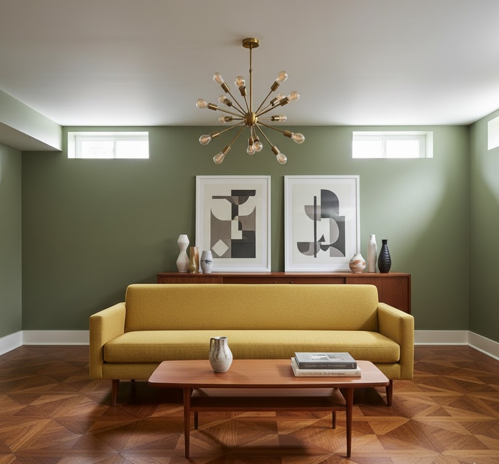 Channel the iconic style of the 1950s and 60s with a Mid-Century basement family room. This design is known for its clean lines, organic shapes, and a blend of natural and manufactured materials. Think teak wood furniture, tapered legs, and vibrant accent colours against a backdrop of muted tones. Iconic pieces like a Sputnik chandelier or a classic Eames lounge chair can define the space. This basement family room offers a nostalgic yet timeless aesthetic, creating a stylish and comfortable environment that celebrates a golden era of design.