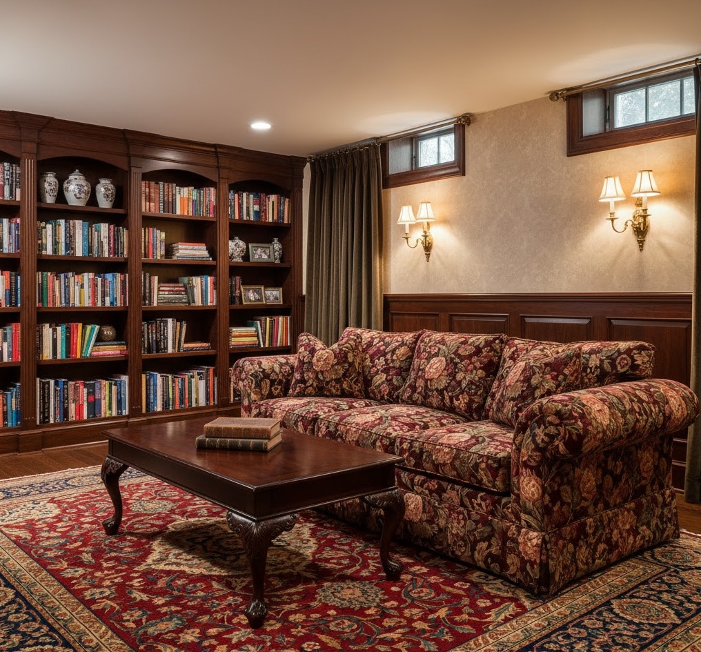 Create a timeless and inviting atmosphere with a traditional basement family hub. This style draws inspiration from classic design, featuring rich wood tones, elegant furnishings, and a warm, inviting colour palette. Think deep reds, forest greens, or classic blues, combined with patterned fabrics and ornate details. Comfortable, upholstered sofas, antique-inspired furniture, and perhaps a built-in bookshelf wall contribute to a sense of heritage and warmth. This basement family room is designed for enduring comfort and sophisticated family living, offering a sense of established elegance and cosiness.