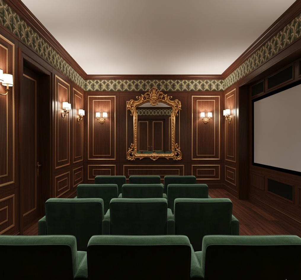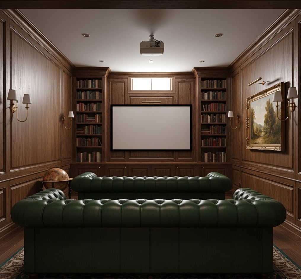Immerse yourself in a world of intellectual charm with an elegant dark academia theater, evoking the sophisticated atmosphere of an old university library. This style is characterised by rich, dark wood panelling, deep leather seating, and bookshelves filled with classic literature. A colour palette of deep greens, burgundies, and browns, accented with brass or antique gold, creates a distinguished and contemplative mood. Vintage globes, antique maps, and classic artwork further enhance the scholarly aesthetic. This basement home theater offers a refined and intimate setting, perfect for appreciating classic films or thought-provoking documentaries in a truly unique environment.