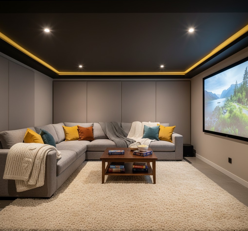 Create a warm and inviting retreat for the whole family with a cosy family basement cinema, prioritising comfort and a relaxed atmosphere. This design focuses on plush, oversized seating, such as a large sectional sofa or bean bags, encouraging everyone to snuggle up. Soft textures like knitted throws, faux fur blankets, and deep-pile rugs add to the snug feel, while warm, dimmable lighting creates the perfect ambience for movie nights. A neutral or soft colour palette, perhaps with pops of cheerful colour, keeps the space feeling bright and welcoming. This basement home theater is designed for shared moments and ultimate relaxation.