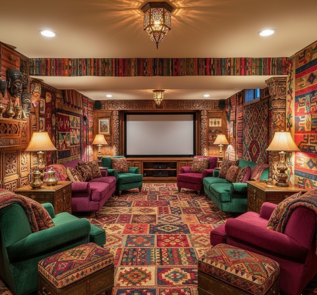 Embark on a journey of discovery with an eclectic global home theater, celebrating diverse cultures and unique finds from around the world. This style is characterised by a rich mix of patterns, textures, and colours, often incorporating handcrafted items, antique furniture, and cultural artefacts. Expect a vibrant colour palette, perhaps with jewel tones, earthy hues, and intricate patterns from textiles like kilim rugs or tapestries. The overall mood is one of well-travelled sophistication and artistic freedom, creating a space that feels personal and full of stories. This basement home theater is a truly unique and inspiring entertainment hub.