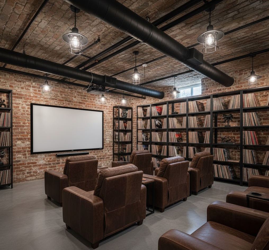 3. Industrial Chic Basement Media Room