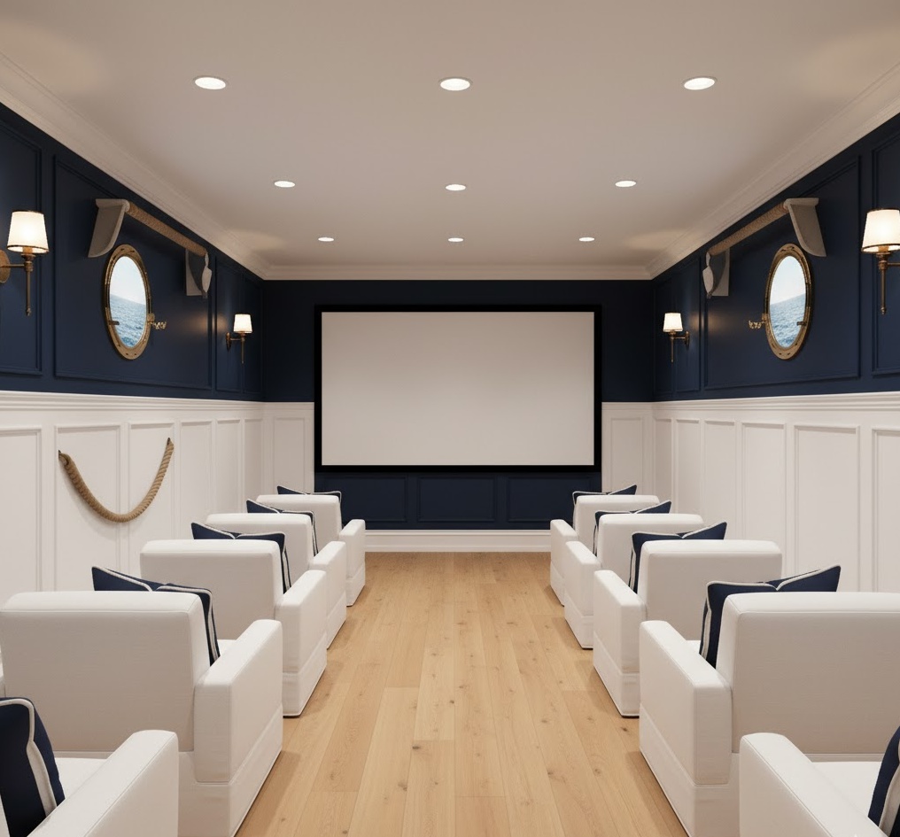 Set sail for cinematic adventures with a nautical themed home theater, evoking the serene and timeless charm of the sea. This style typically features a crisp colour palette of navy blue, white, and sandy beige, often accented with pops of red or brass. Materials like light wood, rope, and striped fabrics are commonly used, creating a fresh and airy feel. Maritime elements such as porthole windows (simulated), ship’s wheel decor, and model boats can be incorporated to enhance the theme. This basement home theater offers a refreshing and distinctive escape, perfect for those who love coastal aesthetics and a sense of adventure.