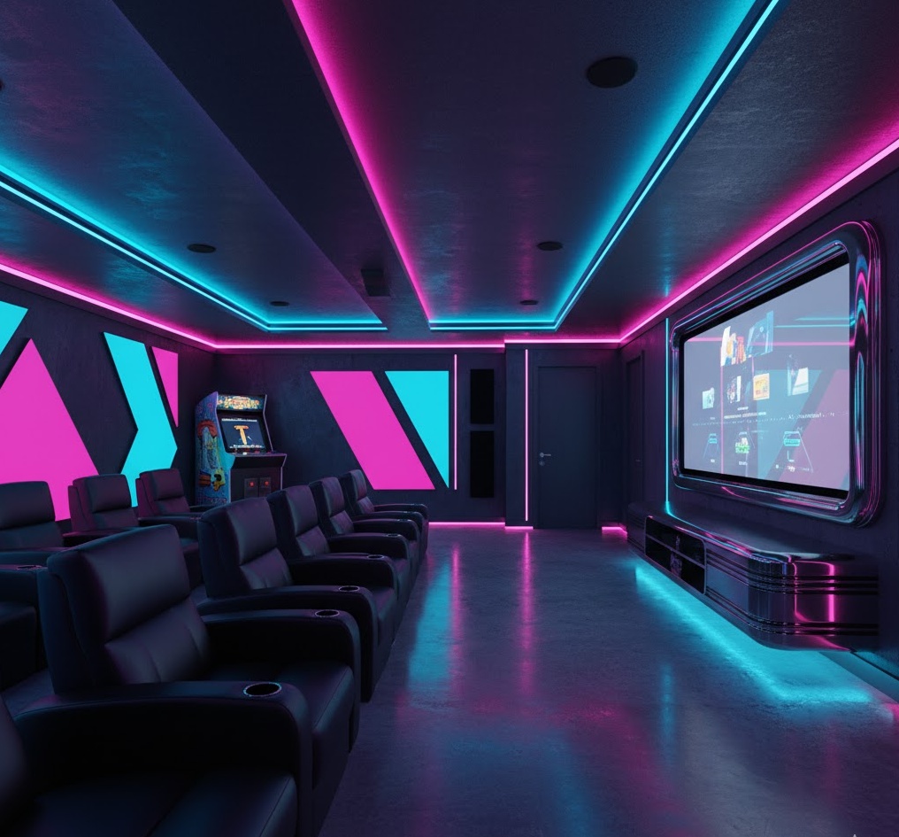 Take a nostalgic trip back to the vibrant 1980s with a retro 80s basement media room, bursting with iconic colours and playful energy. This style is defined by bold geometric patterns, neon lighting in electric blues, pinks, and purples, and a mix of sleek and chunky furniture. Materials like chrome, black leather, and laminate surfaces are often incorporated, alongside vintage arcade machines or classic video game consoles for added authenticity. The overall mood is fun, energetic, and unapologetically bold, creating a unique and memorable entertainment space. This basement home theater is a fantastic homage to a beloved decade.