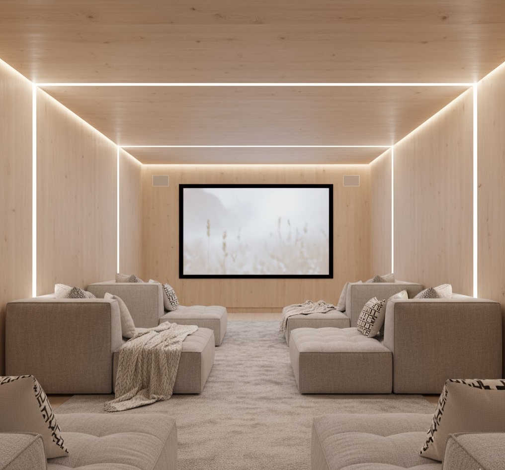 Embrace the principles of ‘hygge’ with a Scandinavian-inspired home theater, focusing on simplicity, functionality, and warmth. This design champions light wood tones, a minimalist aesthetic, and a neutral colour palette of whites, greys, and soft pastels, creating a bright and airy feel. Plush, comfortable seating in natural fabrics like wool or cotton, adorned with soft throws and cushions, ensures cosiness. Integrated storage solutions keep the space uncluttered, while subtle, layered lighting enhances the inviting atmosphere. This basement home theater is perfect for those who appreciate understated elegance and a tranquil, comfortable viewing experience.