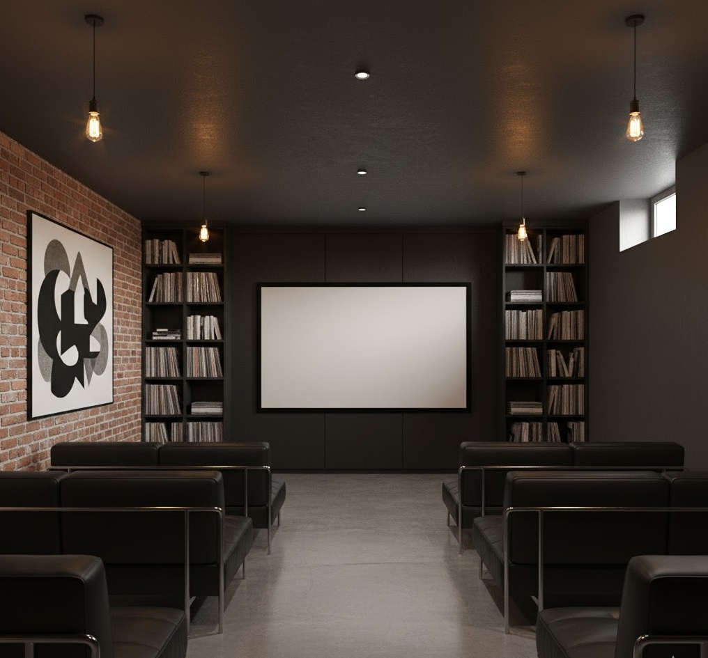 Capture the essence of city living with an urban loft basement cinema, blending industrial edge with modern sophistication. This style often features exposed brick walls, concrete flooring, and high (or simulated high) ceilings, creating an open and airy feel. A neutral colour palette of greys, blacks, and whites is typically used, with metallic accents and contemporary art adding visual interest. Sleek, minimalist furniture in leather or metal, along with industrial-style lighting, completes the look. This basement home theater offers a chic and contemporary space, perfect for those who appreciate a sophisticated, city-inspired aesthetic.