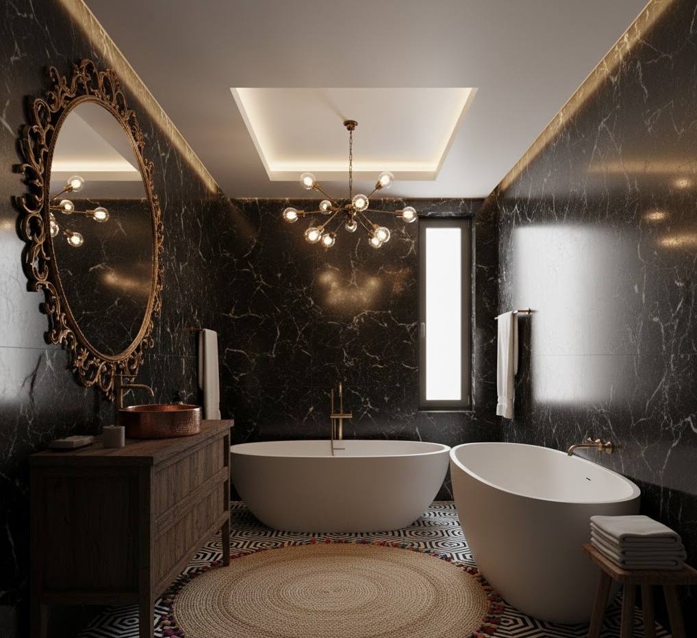 Unleash your creativity with eclectic bathroom decor mixes, celebrating a harmonious blend of diverse styles and periods. This vibrant approach allows for a personalised palette, often combining bold colours with unexpected patterns and textures. Materials are varied, ranging from vintage finds and antique furniture to modern fixtures and global textiles, all curated to tell a unique story. The mood is playful, expressive, and deeply individual, reflecting the homeowner’s personality without strict adherence to one aesthetic. These bathroom ideas decor choices encourage bold experimentation, resulting in a truly one-of-a-kind space that is both functional and visually captivating.