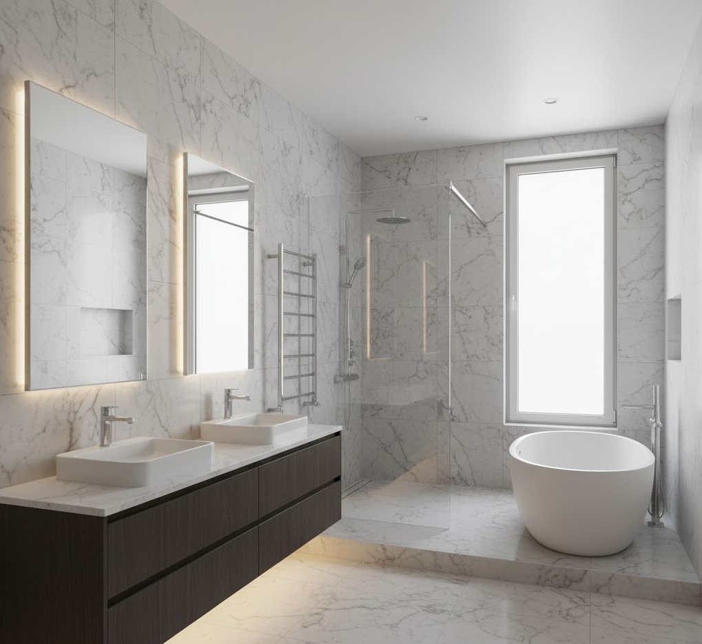 Indulge in sophisticated elegance with contemporary luxury bathroom inspo, defined by high-end finishes, innovative design, and seamless integration of technology. This style often features large format tiles, bespoke cabinetry, and state-of-the-art fixtures, creating a sleek and opulent environment. A refined colour palette of deep charcoals, rich browns, and polished metallics is common, often contrasted with crisp whites. Functionality is paramount, with smart features and ergonomic designs. The mood is one of exclusive comfort and modern grandeur, offering an unparalleled bathing experience.