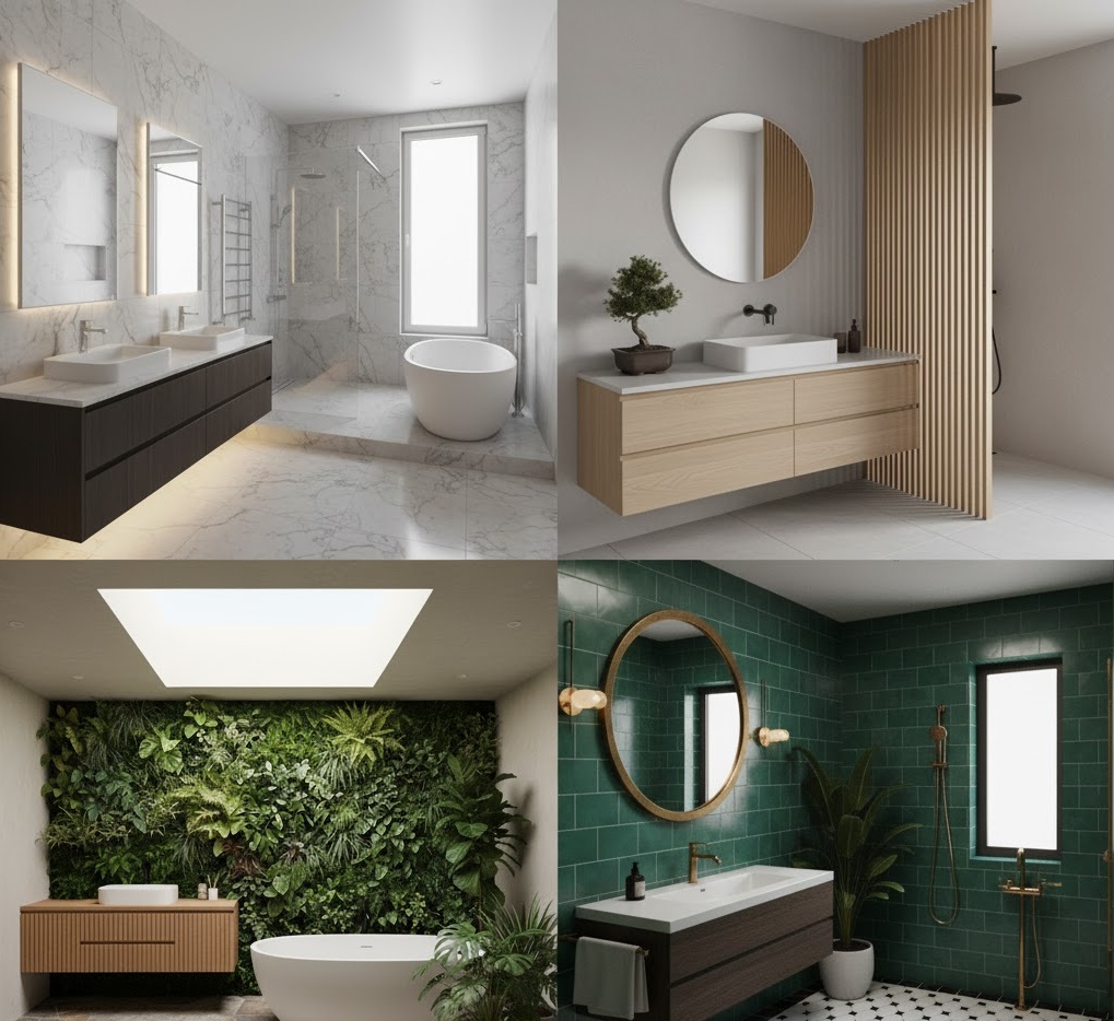 Connect with nature through biophilic bathroom oasis inspo, integrating natural elements to enhance well-being and create a calming environment. This style prioritises an abundance of plants, natural light, and organic materials like wood, stone, and bamboo. A palette of greens, earthy browns, and soft whites dominates, fostering a sense of peace and freshness. Functionality often includes features that mimic natural processes, such as rain showers or natural ventilation. The mood is one of serene harmony and revitalisation, bringing the restorative power of the outdoors inside.