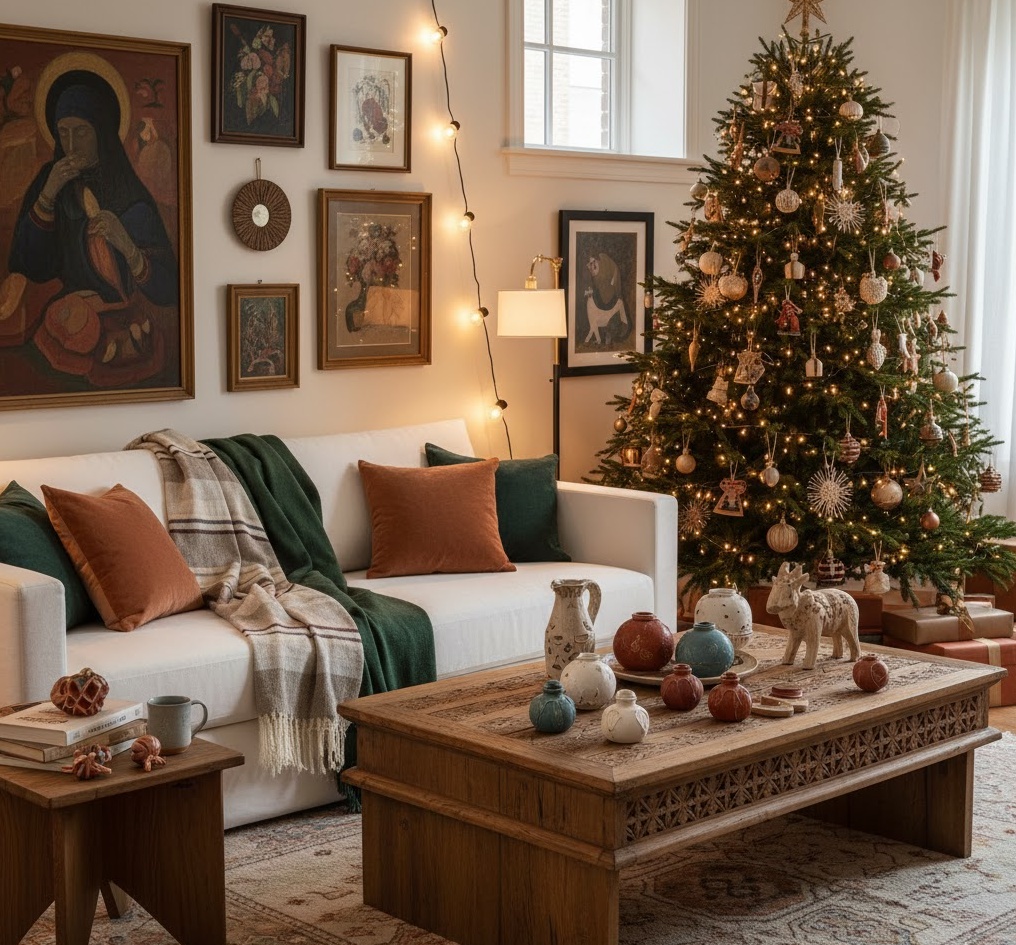 An eclectic bohemian holiday style celebrates individuality and a confidently curated mix of diverse elements. This approach encourages combining different patterns, textures, and periods, creating a truly unique and personal festive display. Materials range from global textiles to modern ceramics and vintage finds, all brought together with a confident, artistic eye. The colour palette is vibrant and varied, often featuring unexpected pairings that create visual interest and a joyful, celebratory atmosphere. Functionally, it allows for boundless creative expression, making your home a dynamic reflection of your travels and passions during the Christmas season.