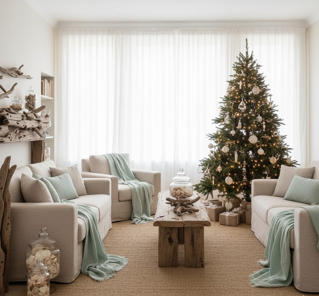 Bring the relaxed vibe of the seaside to your festive decor with a coastal bohemian Christmas, blending natural textures with a laid-back, free-spirited aesthetic. This style features elements like driftwood, shells, and linen, creating an airy and tranquil atmosphere. The colour palette is inspired by the ocean and sand: soft blues, seafoam greens, sandy whites, and natural wood tones, evoking a sense of calm. The mood is breezy and refreshing, offering a serene escape from traditional heavy Christmas themes. Functionally, it encourages an open, airy feel, making your home feel like a peaceful beach retreat even during the winter holidays.