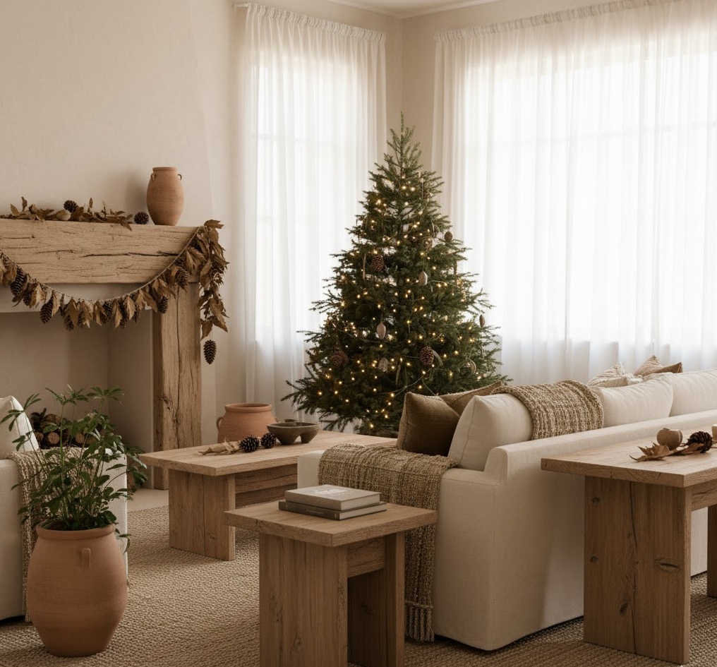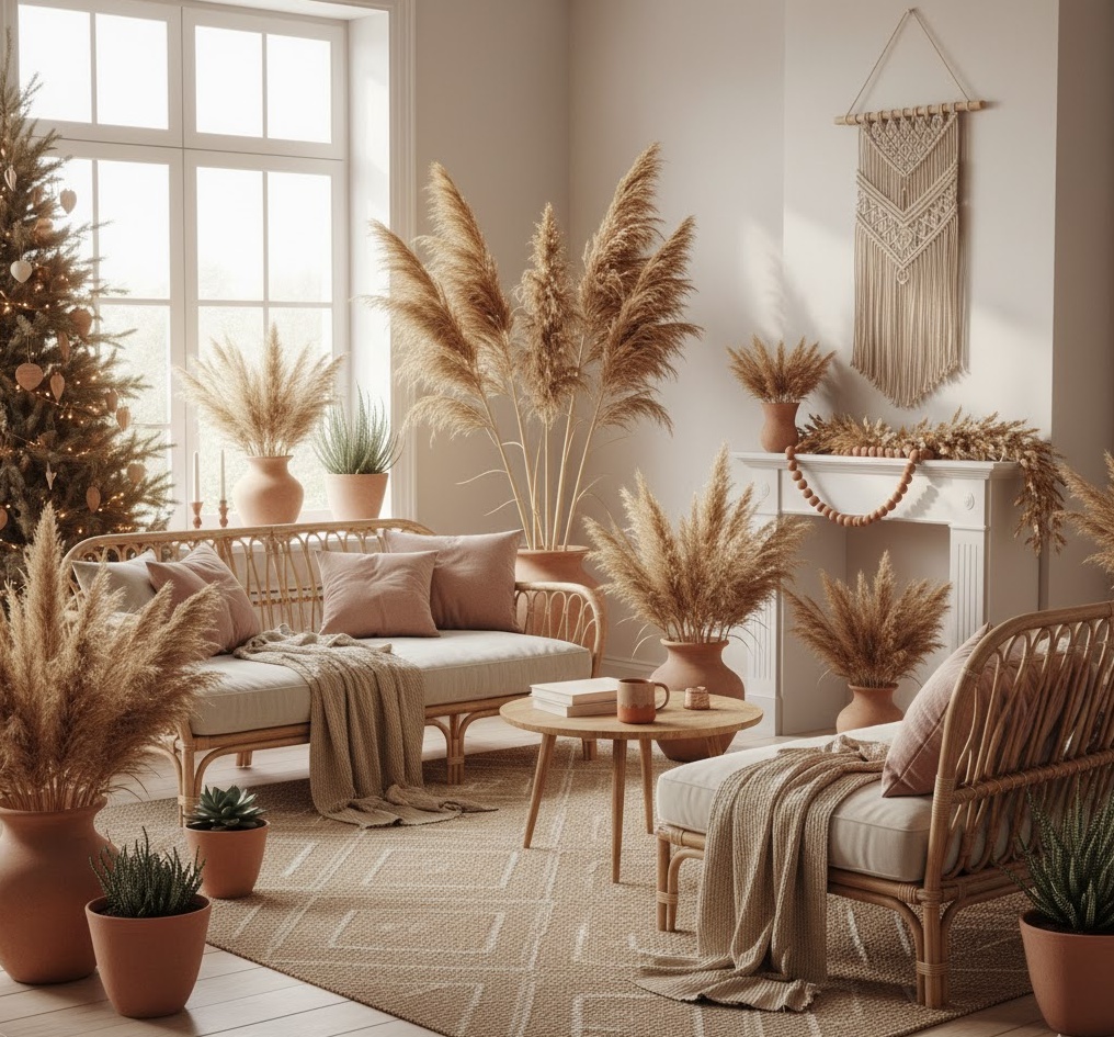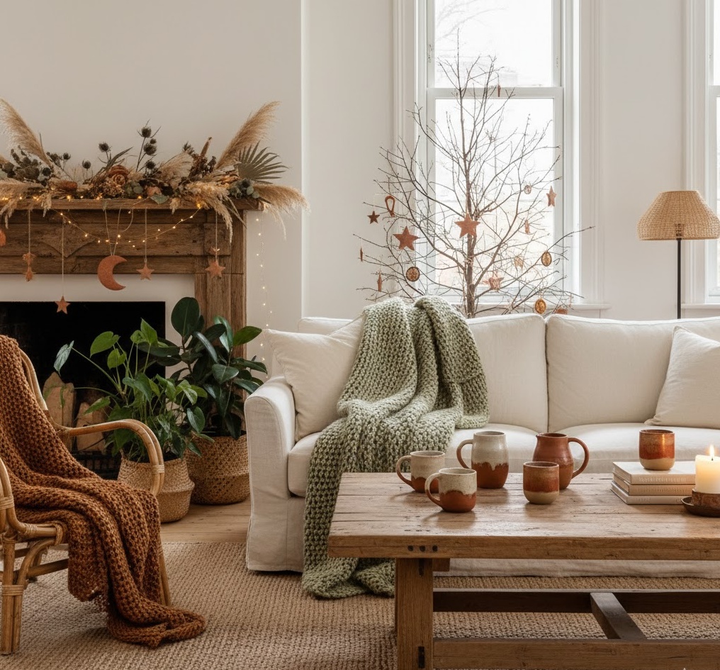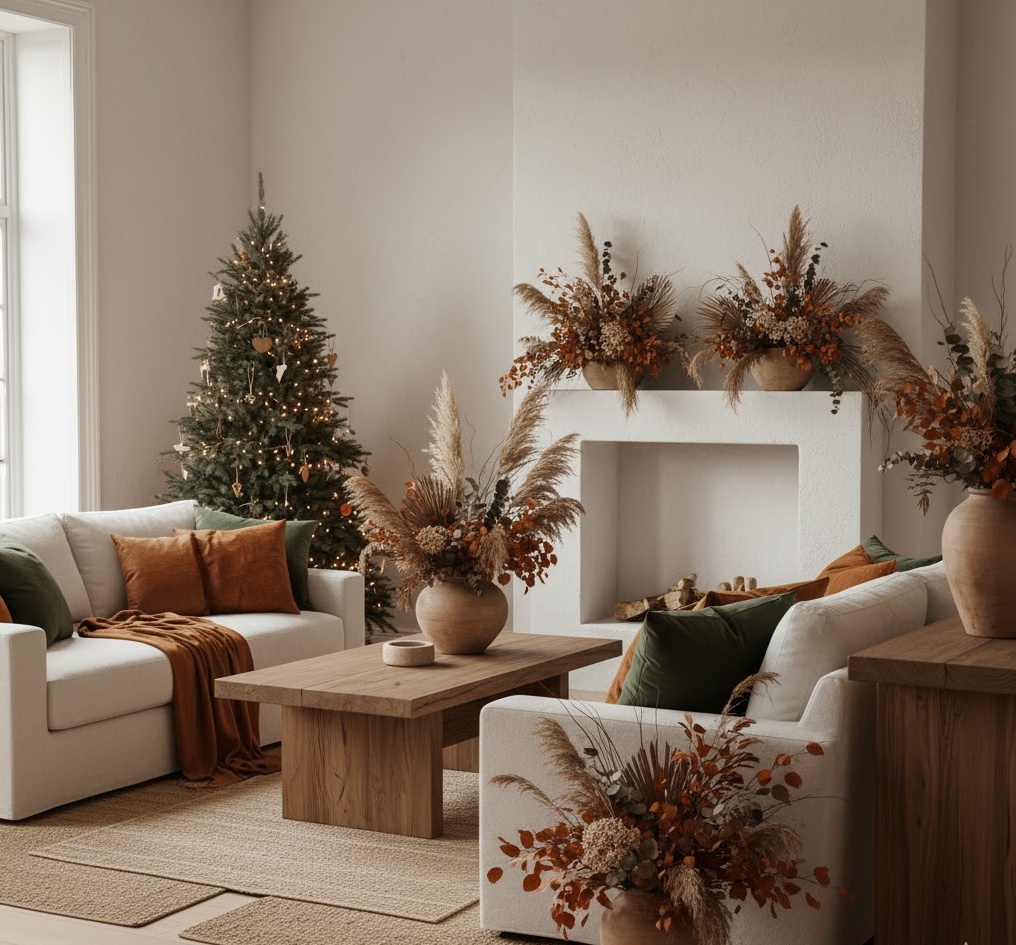 Create a deeply grounding and natural festive atmosphere with earthy bohemian Christmas vibes, prioritising organic materials and a connection to nature. This style features raw wood, jute, cotton, and abundant dried botanicals, bringing an authentic, tactile quality to your decor. The colour palette is directly inspired by the natural world: deep forest greens, warm browns, sandy beiges, and subtle hints of burnt orange. The mood is one of serene comfort and peaceful contemplation, making your home a tranquil sanctuary. Functionally, it promotes a relaxed environment with soft furnishings and natural textures that invite touch and calm throughout the holidays.