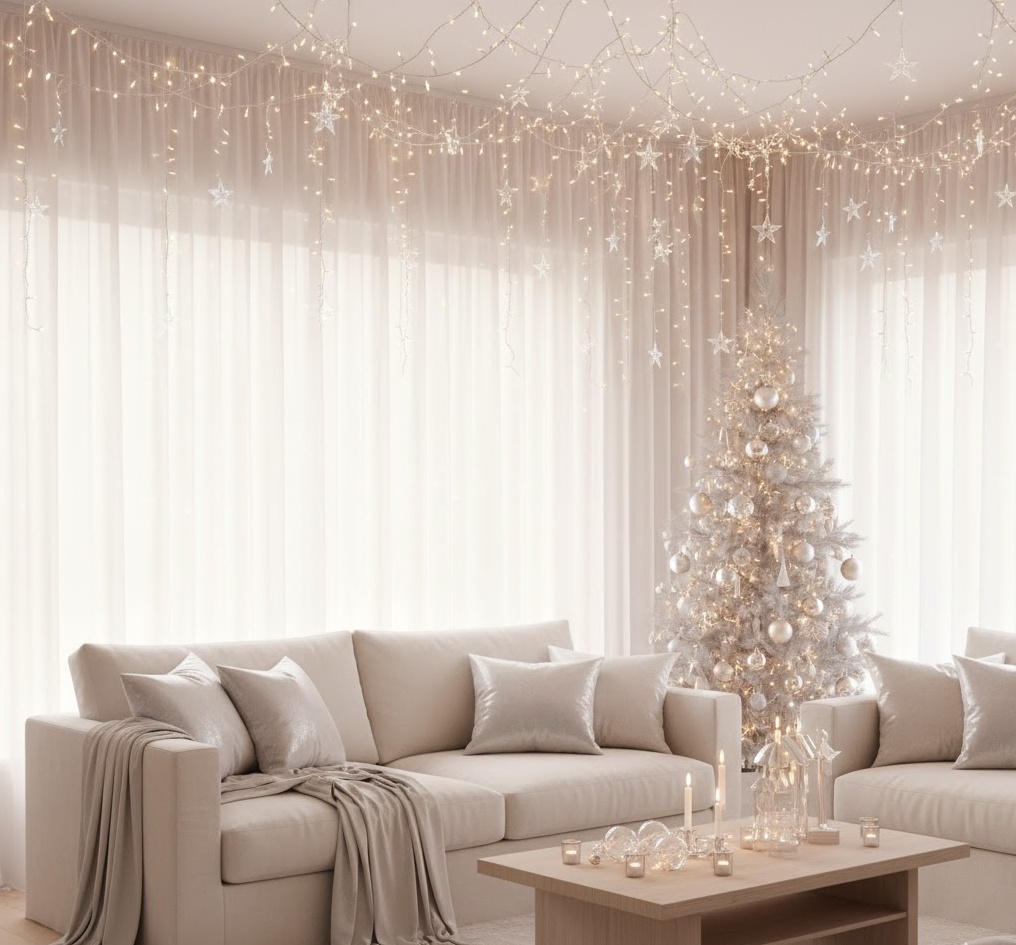 Create an ethereal and enchanting atmosphere with a dreamy bohemian Christmas style, focusing on soft, flowing fabrics and delicate illumination. This approach uses sheer curtains, delicate fairy lights, and iridescent accents that evoke a sense of magic and wonder. Materials include silk ribbons, glass ornaments, and subtle glitter or pearl embellishments, adding a touch of sparkle. The colour palette is light and airy, featuring pastels, whites, silvers, and soft golds, creating a gentle, otherworldly glow. The mood is serene and romantic, transforming your home into a whimsical wonderland for the holiday season.