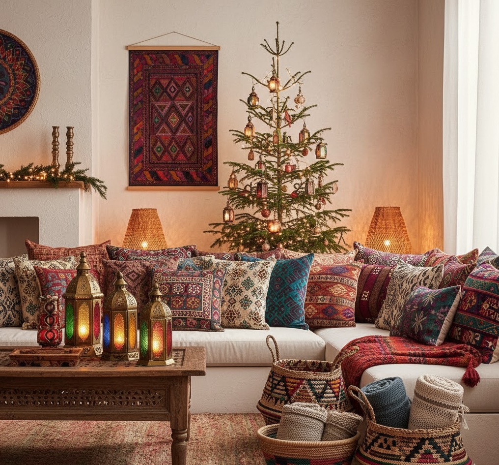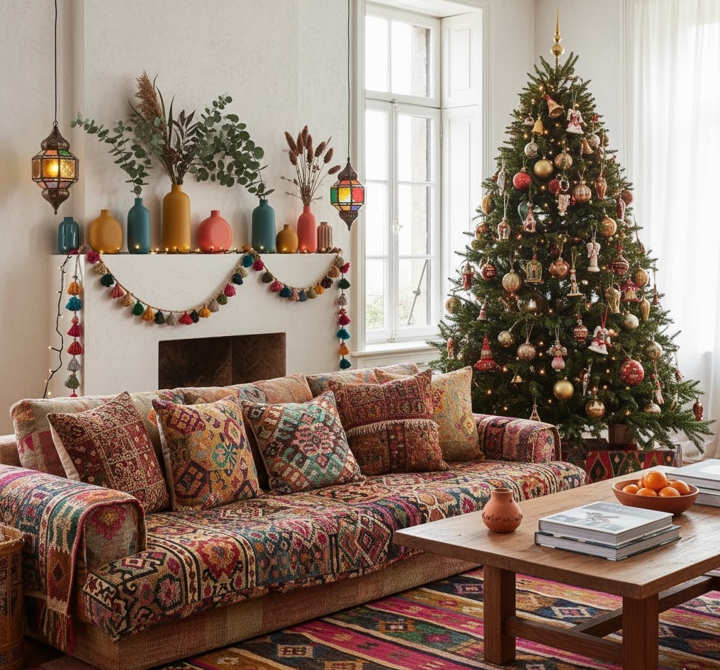 Infuse your Christmas with a global bohemian spirit, drawing inspiration from diverse cultures and artisanal crafts worldwide. This style incorporates textiles with intricate patterns, vibrant colours, and unique handcrafted ornaments collected from various travels. Think Moroccan lanterns, Indian block print fabrics, and African-inspired woven baskets, all harmoniously blended to tell a story. The mood is adventurous and celebratory, creating a rich tapestry of textures and cultural narratives within your festive decor. Functionally, it encourages a layered approach, making every corner feel discovered and cherished during the holiday period.