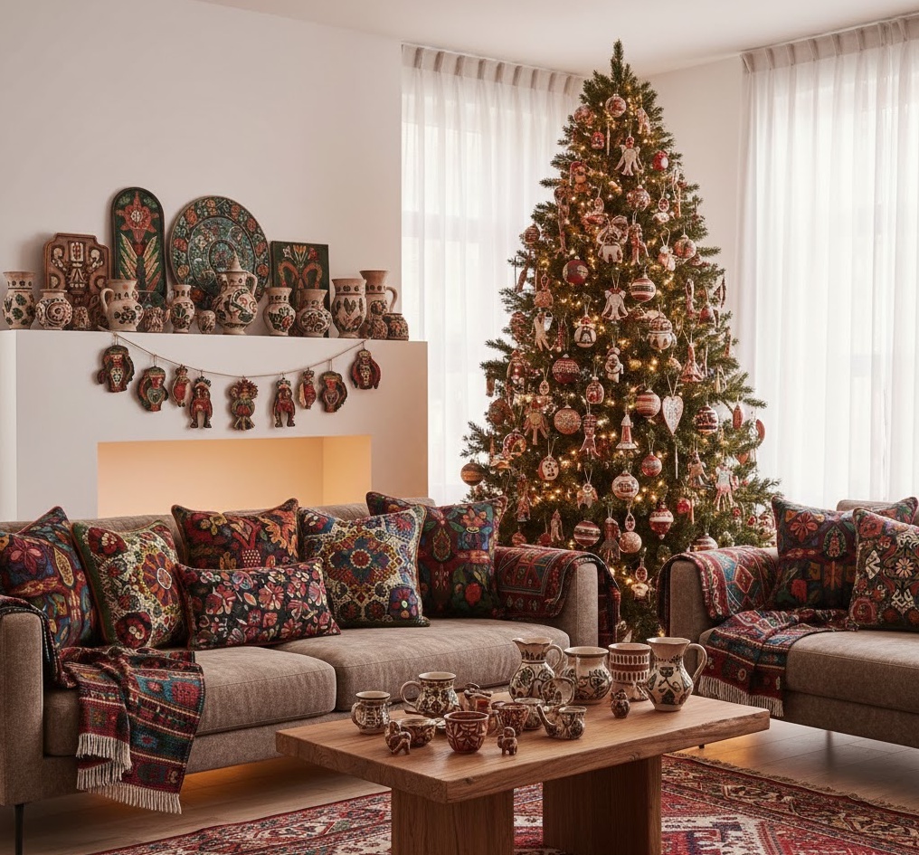 Celebrate heritage and storytelling with a folk bohemian Christmas, drawing inspiration from traditional crafts and cultural motifs. This style incorporates embroidered textiles, hand-painted ornaments, and elements reminiscent of folk art from various regions, adding rich character. Materials often include wool, felt, carved wood, and ceramic, showcasing intricate patterns and vibrant, symbolic designs. The colour palette is rich and diverse, featuring deep reds, blues, greens, and yellows, often in bold, contrasting combinations. The mood is warm, celebratory, and deeply rooted in tradition, creating a festive home full of character and cultural charm.