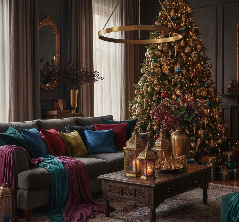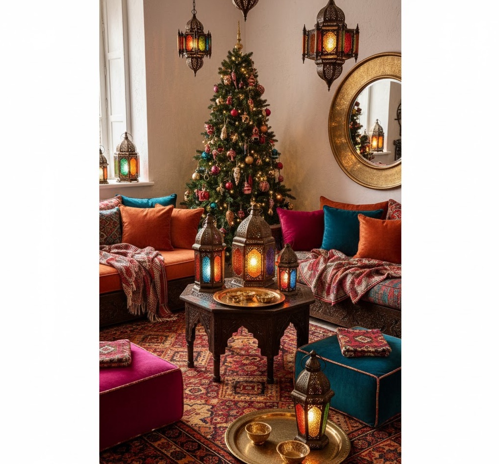 Transport your festive space to a vibrant souk with a Moroccan boho Christmas, rich in exotic patterns and warm, inviting textures. This style incorporates intricate lanterns, patterned rugs, plush pouffes, and gleaming metallic accents, creating an opulent feel. Materials like hammered brass, colourful tiles, and richly embroidered fabrics are central to this luxurious look. The colour palette is bold and warm, featuring deep reds, oranges, fuchsia, and teal, often contrasted with shimmering gold. The mood is enchanting and luxurious, creating a truly immersive and sensory experience for your holiday celebrations.