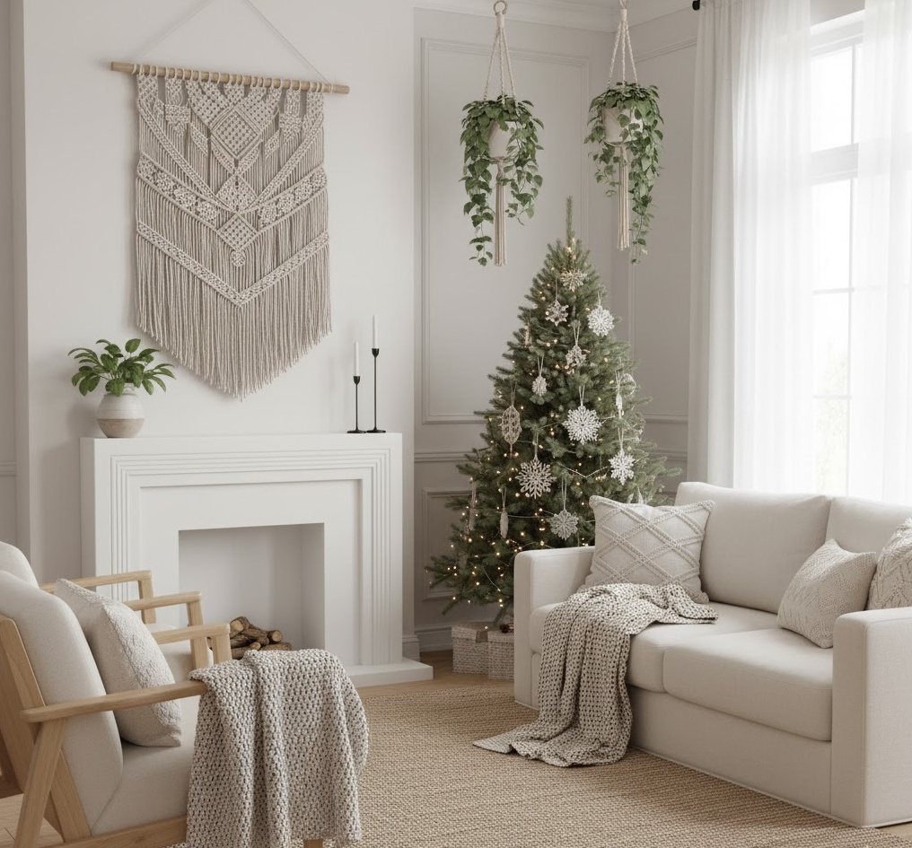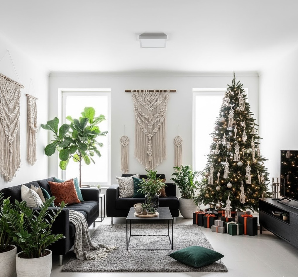 Give your festive decor a contemporary edge with a modern boho Christmas twist, blending sleek design with free-spirited elements. This style combines clean lines and minimalist furniture with bohemian textures like macrame, rattan, and lush indoor plants. Materials include polished concrete, metal accents, and natural wood, softened by cosy textiles and abstract art. The colour palette often features a base of neutrals like black, white, and grey, with pops of muted jewel tones or earthy hues for contrast. The mood is sophisticated yet relaxed, creating a chic and functional space that feels fresh and inviting for the holidays.